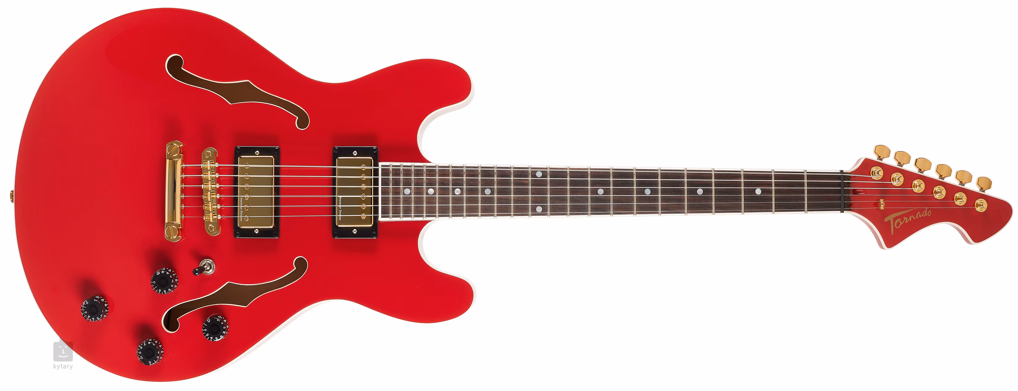 Gitara semi-hollowbody Tornado II SB SD GH RW BCG posiada klonowy korpus z klonowym topem i błyszczącym wykończeniem Jawa Red. Palisandrowa podstrunnica z dwudziestoma dwoma progami Medium Jumbo jest przyklejona do klonowej szyjki o wygodnym profilu "C". Białe kropki na podstrunnicy ułatwiają orientację.