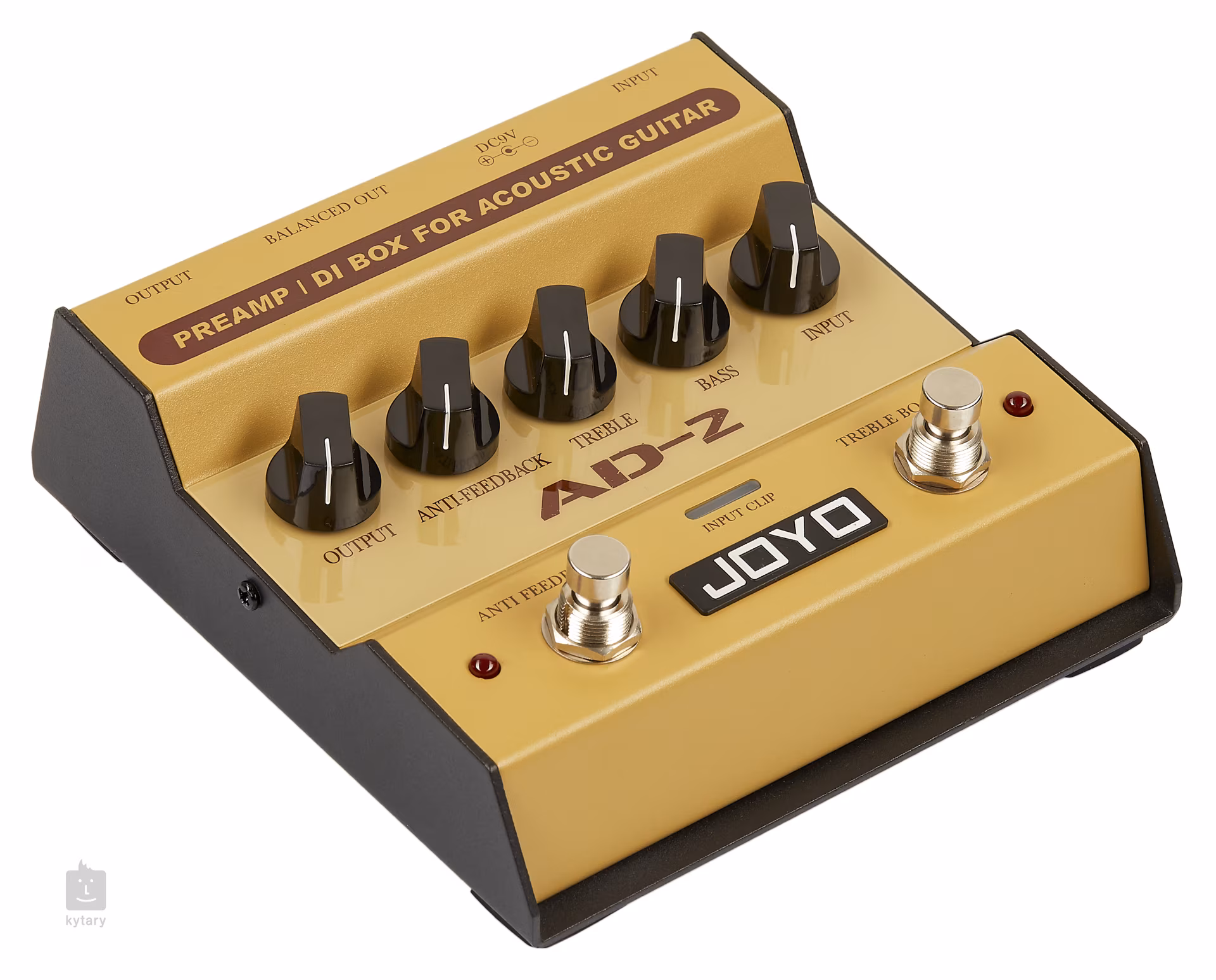 AD-2 to przedwzmacniacz do instrumentów akustycznych i DI box z wbudowanym dwupasmowym korektorem (Bass, Treble), który pozwala uzyskać pożądany dźwięk. Jeśli nadal uważasz, że dźwięk jest zbyt mdły/przytłumiony, naciśnij przełącznik nożny Treble Boost, aby wzmocnić dźwięk w wyższych częstotliwościach. Aktywacja funkcji Antifeedback tłumi wszelkie szumy w postaci możliwego sprzężenia zwrotnego. Wskaźnik Input Clip informuje o tym, że sygnał wejściowy jest zbyt silny i należy go wycofać za pomocą odpowiedniego pokrętła Input.