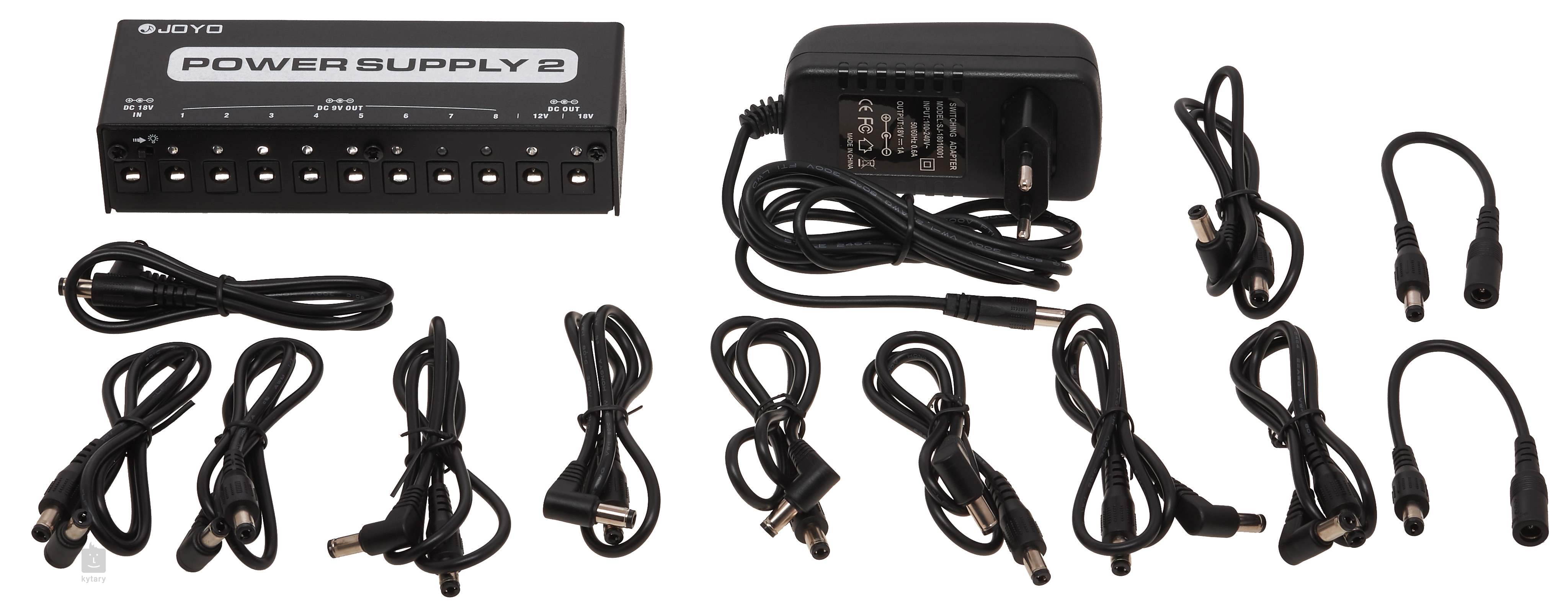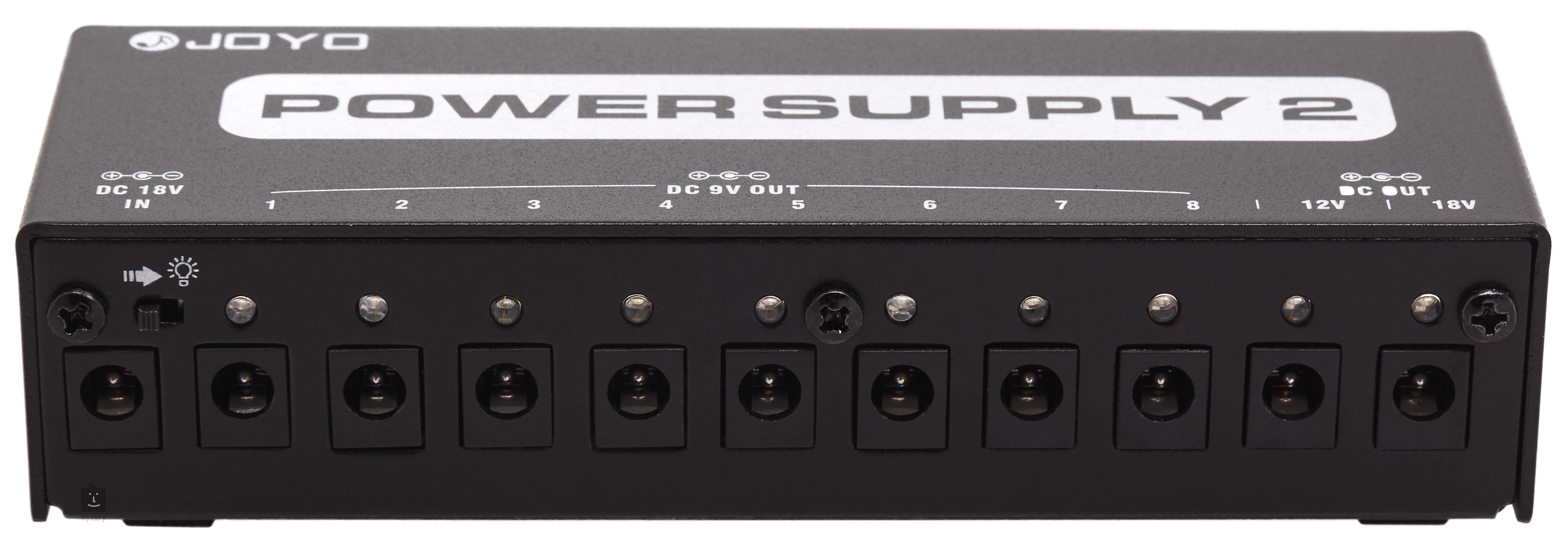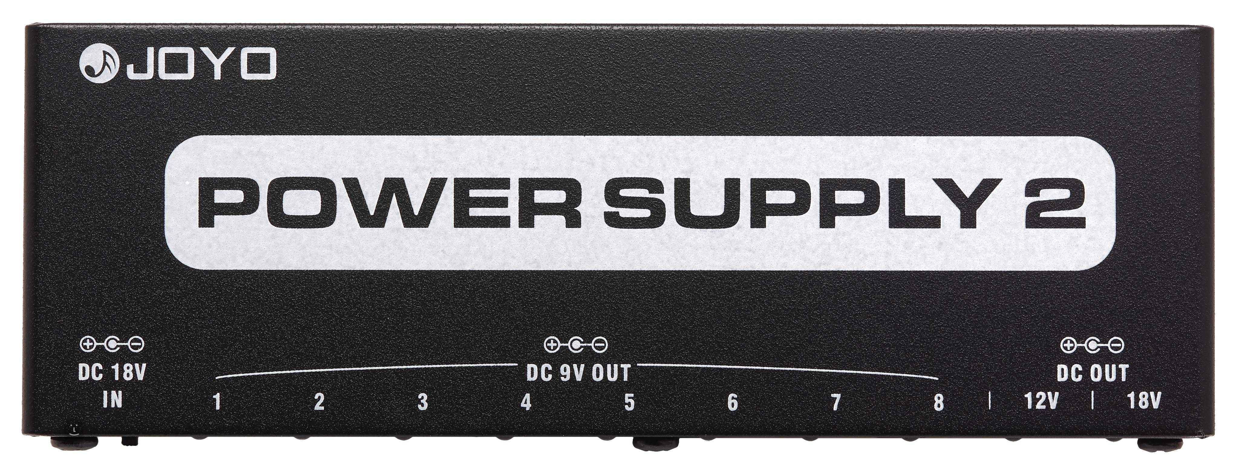 Wielofunkcyjny adapter Joyo JP-02 oferuje łącznie 10 wyjść (7x 9 V DC 100 mA, 1x 9 V DC 500 mA, 1x 12 V DC 100 mA i 1x 18 V DC 100 mA). Posiada również wskaźnik LED i zabezpieczenie przed zwarciem lub przepięciem. W zestawie znajduje się zasilacz i niezbędne kable połączeniowe.