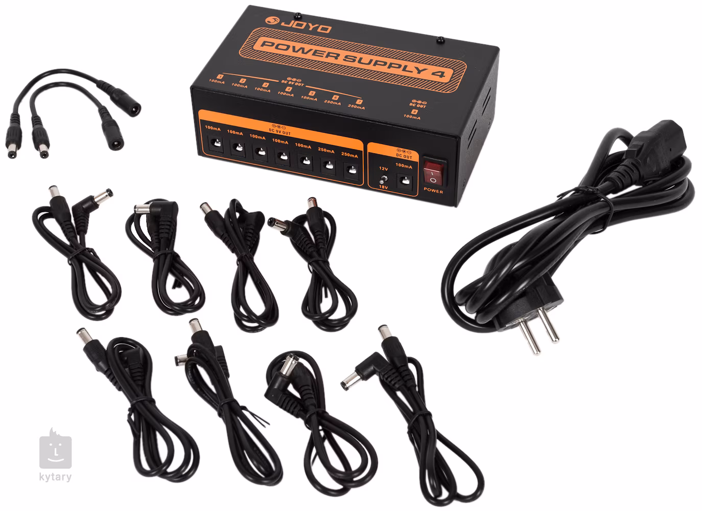 Joyo JP-04 to multiadapter, który w prosty i skuteczny sposób rozwiązuje kwestię zasilania pedalboardu. Jest wyposażony w 8 izolowanych wyjść, z których jedno oferuje przełączanie między 12 a 18 V, a pozostałe siedem to 9 V (5x 100 mA, 2x 250 mA). Ponadto zapewnia ochronę przed zwarciem lub przepięciem, zapewniając absolutną niezawodność. W zestawie znajdują się również niezbędne kable połączeniowe.
