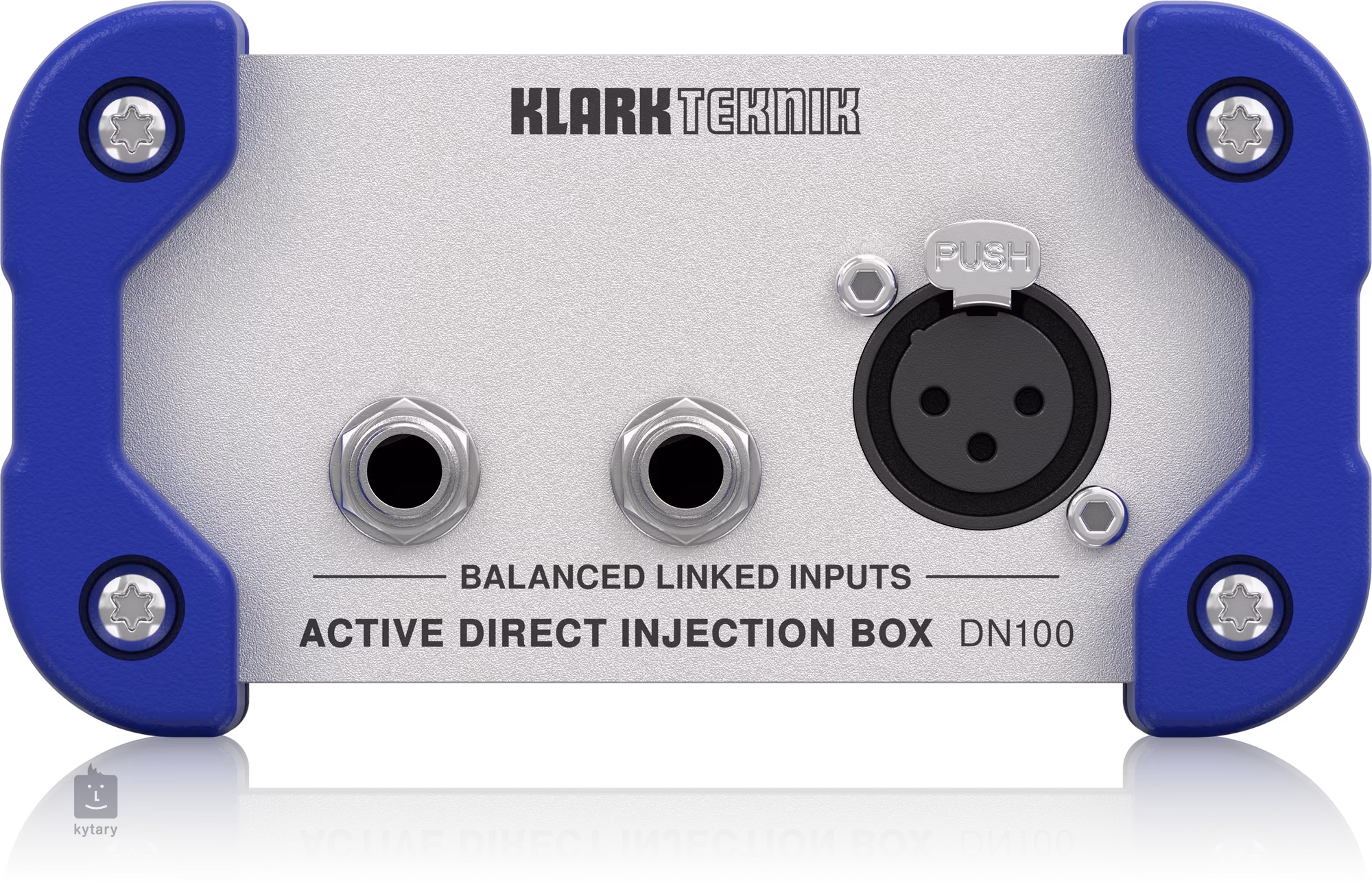 KLARK TEKNIK DN 100 to aktywny DI box z zasilaniem fantomowym 48 V, wejściami (2x jack 6,3 mm, XLR), wyjściem XLR, wybieranym tłumieniem (-20 dB), przełączanym uziemieniem i aluminiową obudową.