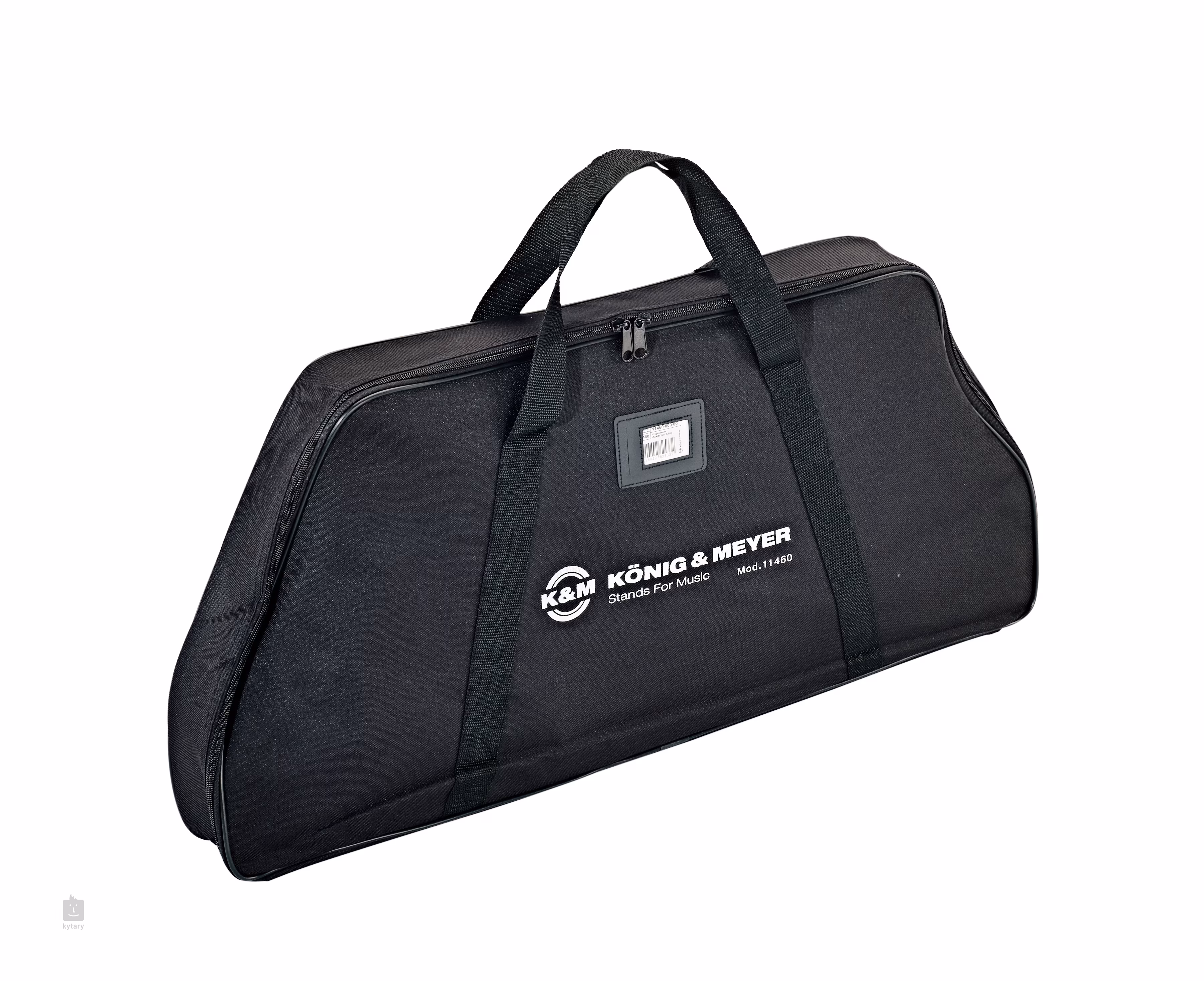 Przenośny futerał na statywy muzyczne (np. K&M 11940) z podwójną rączką, podłużnym zamkiem błyskawicznym, dwoma wewnętrznymi przegródkami i zewnętrzną kieszenią do przechowywania nut i drobnych akcesoriów.