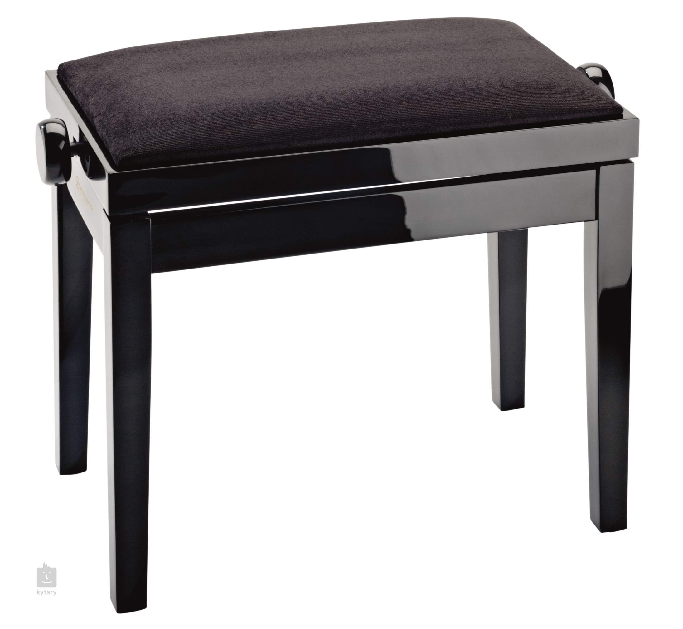 Klasyczny stołek do fortepianu z łatwą regulacją wysokości i wygodnym siedziskiem pokrytym czarnym aksamitem. Fotele są dostępne w wykończeniu błyszczącym i matowym.