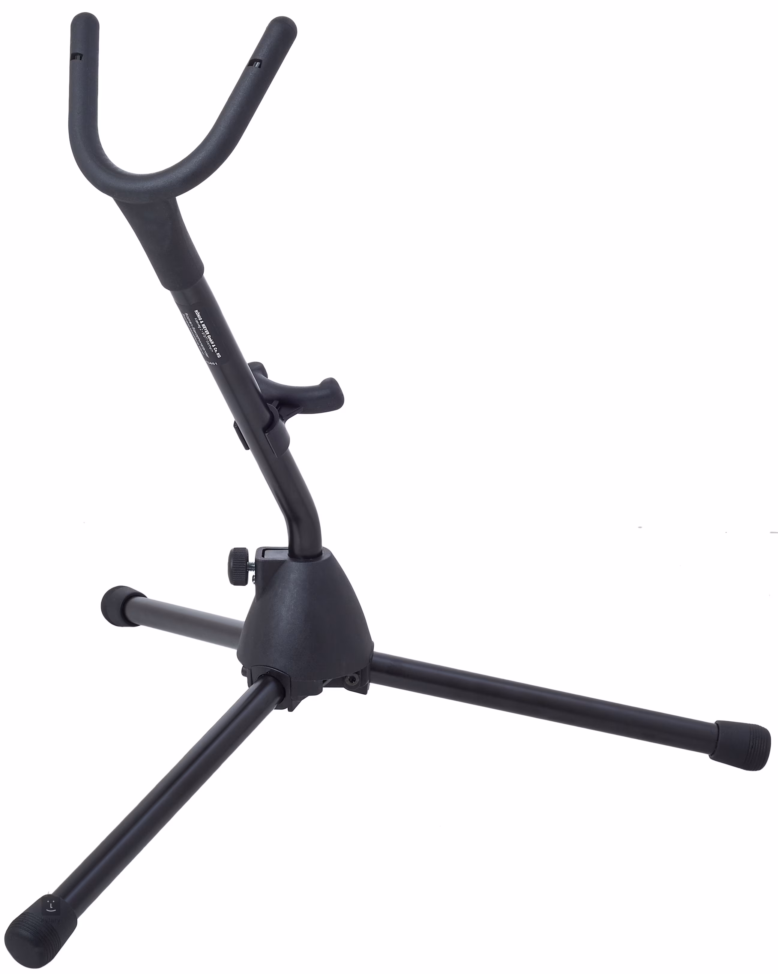 Stalowy statyw do saksofonów altowych/tenorowych z podstawą z laminatu. Regulowane uchwyty pozwalają na dopasowanie do instrumentów o różnych szerokościach i długościach płyt rezonansowych. Części stykające się z instrumentem są wykonane z gumowanego materiału, aby zapobiec uszkodzeniu saksofonu. Dodatkowe statywy 14301/15281 na saksofon sopranowy/klarnet/tubę można przykręcić do nóg statywu.
