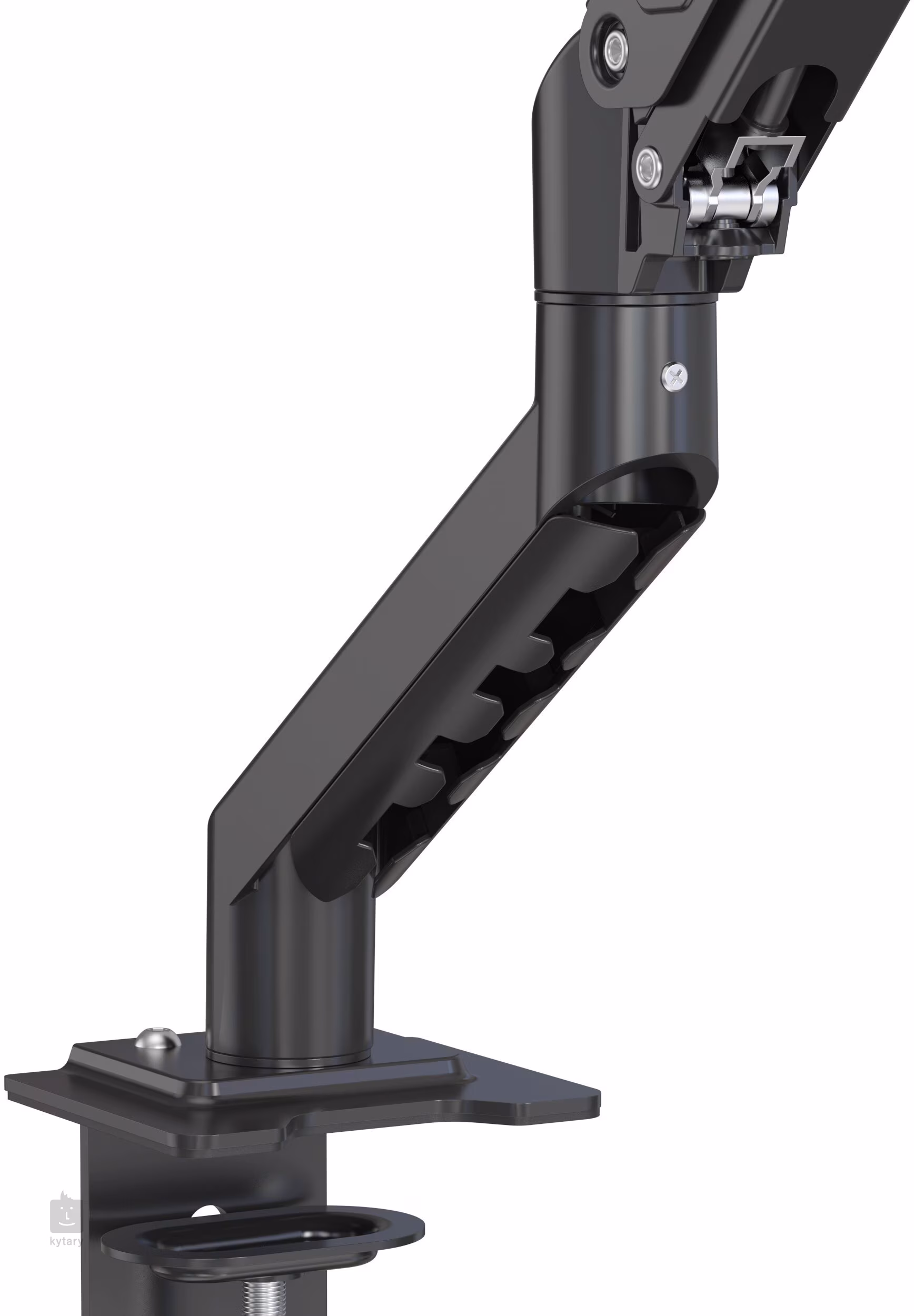 Ramię jest wyposażone w sprężynę pneumatyczną, która umożliwia płynną regulację wysokości w zakresie od 150 do 390 mm. Platforma może być dodatkowo przechylana w zakresie od -85° do +90°, obracana o 180°, a całe ramię oferuje obrót o 360°, dzięki czemu można łatwo ustawić idealny kąt widzenia dla wygodnej i zdrowej pozycji pracy. Konstrukcja łączy aluminiowe ramię ze stalową płytą na laptopa, co zapewnia wysoką wytrzymałość i długą żywotność.
