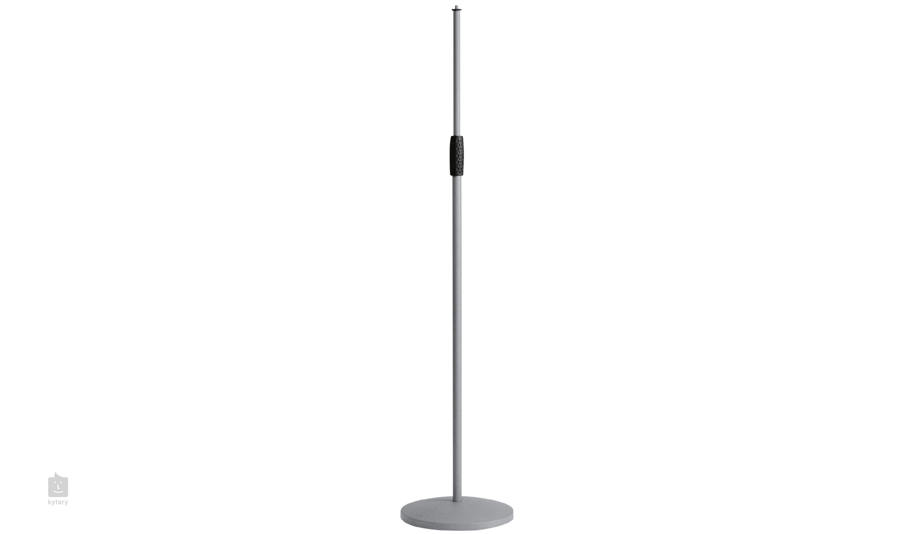 Stalowy statyw mikrofonowy z regulowaną wysokością i płaską żeliwną podstawą z gumową wkładką zapobiegającą przenoszeniu drgań. Pokryte atrakcyjnym szarym kolorem z miękkim w dotyku wykończeniem.