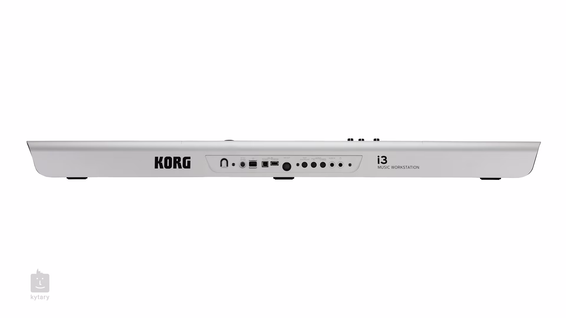 Samodzielnie, na scenie lub w studio Muzyczna stacja robocza KORG i3 jest gotowa na każdą sytuację i oferuje wiele złączy na tylnym panelu. Gdy urządzenie i3 nie jest zasilane z akumulatora, można je podłączyć do odpowiedniego źródła prądu zmiennego za pomocą dostarczonego adaptera szeregowego. W tylnym panelu znajduje się haczyk do przytrzymywania przewodu zasilającego, aby zapobiec uszkodzeniu narzędzia w razie przypadkowego potknięcia. Znajdziesz tu dwa wyjścia 1/4" (lewe/mono i prawe) do monitorowania dźwięku, jak również stereofoniczne wyjście słuchawkowe 1/8". Jest też wejście audio 1/8". Do kontrolera nożnego dołączone jest gniazdo 1/4", które w zależności od ustawień i3 może działać jako pedał przełącznika nożnego lub pedał ekspresji. Wyjście MIDI wysyła informacje o wysokości dźwięku, dynamice czasowej i nutach wykonywanych z i3 do innych instrumentów wyposażonych w MIDI lub urządzeń audio. Dostępne są dwa porty USB. Port USB TO DEVICE pozwala na zapisywanie i ładowanie danych użytkownika oraz utworów do i z pamięci USB. Aby podłączyć urządzenie i3 do komputera, należy użyć portu USB komputera głównego.