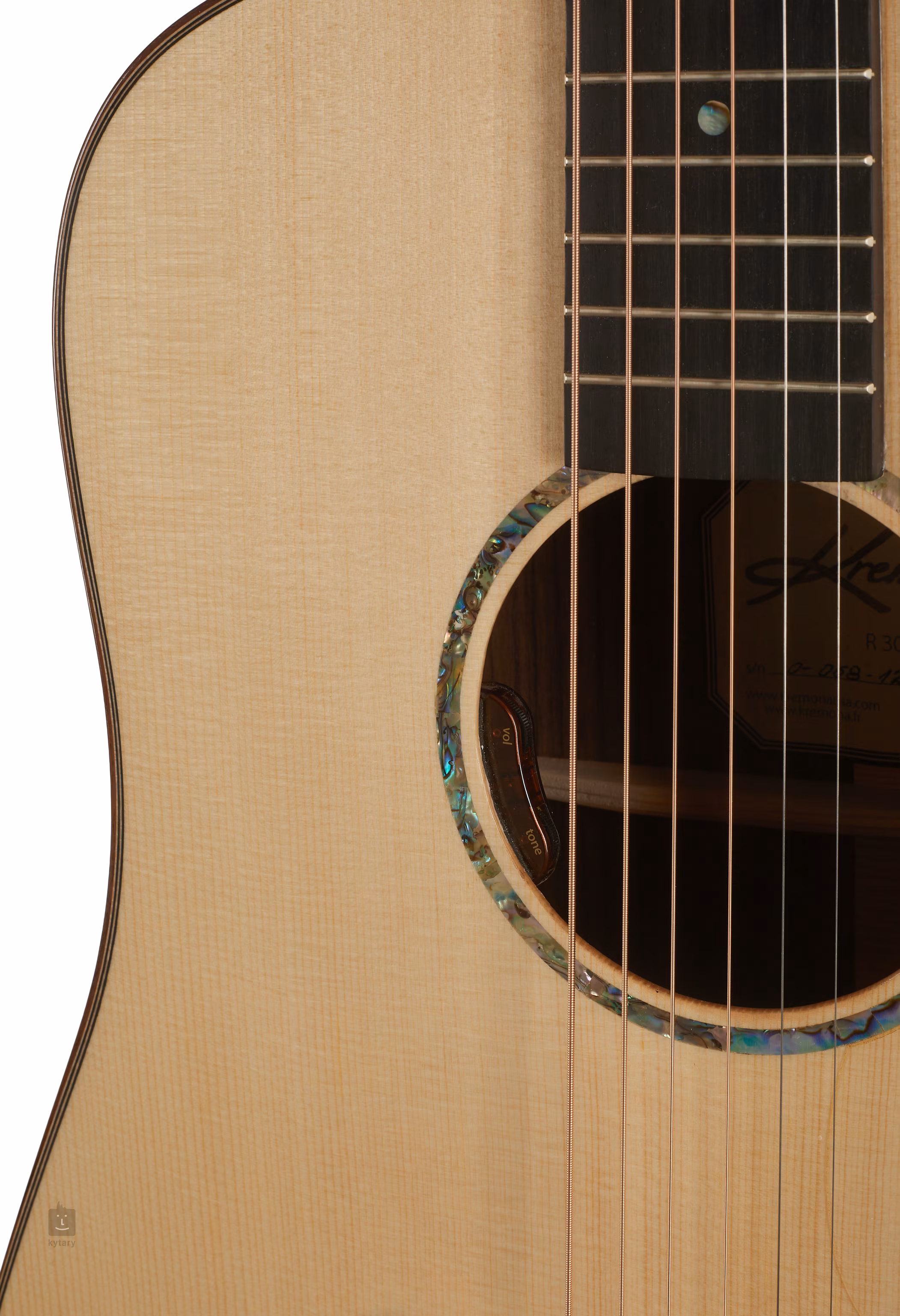 R30E Dreadnought to gitara elektroakustyczna z warsztatów europejskiej marki Kremona, która ma ponad stuletnią tradycję. Jest to instrument z dużym rezonansowym korpusem typu Dreadnought i mocnym brzmieniem, wykonany w całości z litego drewnaświerkowego i indyjskiego palisandru. Rezonans płyty przedniej wspierają ręcznie wycięte żebra (scalloped bracing).