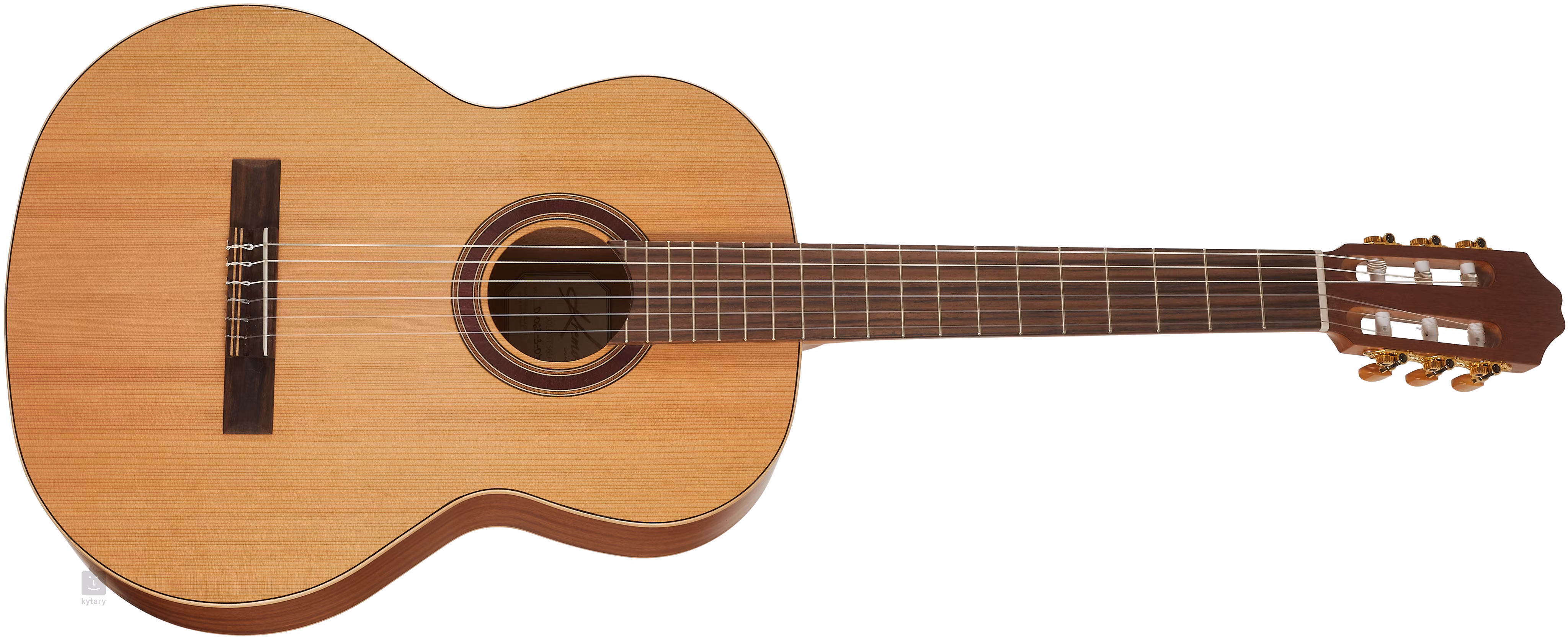 Struny są zamocowane przez zerowy i siodełkowy próg z materiału ABS w stroikach w złotym wykonaniu i palisandrowym mostku. Ładne wykończenie podkreśla drewniana obwódka i ręcznie inkrustowana drewniana rozeta.