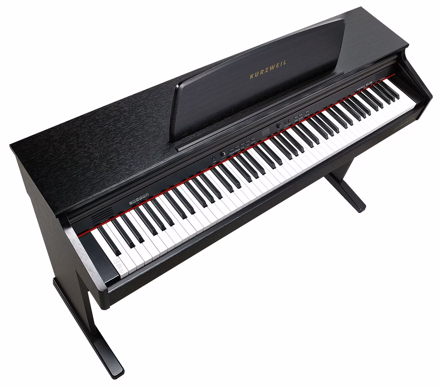 Wszystkie elementy sterujące i wyświetlacz są dostępne bezpośrednio z panelu przedniego. Wykończenie z imitacji palisandru z pewnością zawstydzi Twój dom, a Twoje palce są chronione przez wsuwaną osłonę klawiatury. W zestawie znajduje się również stołek.