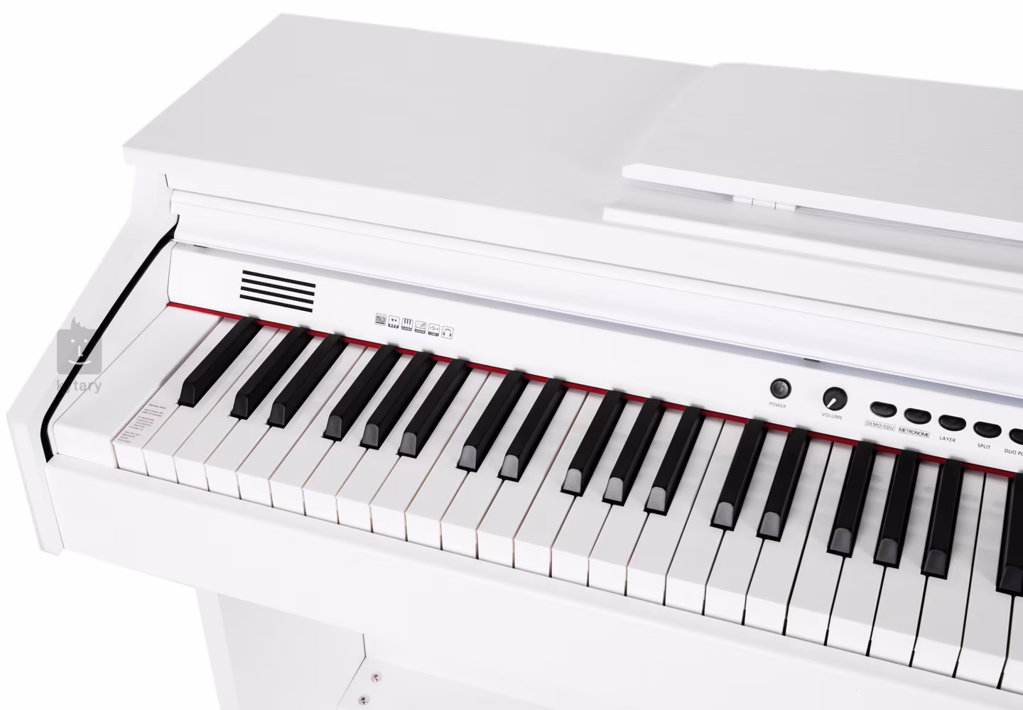 Wszystkie elementy sterujące i wyświetlacz są dostępne bezpośrednio z panelu przedniego. Wykończenie z imitacji palisandru z pewnością zawstydzi Twój dom, a Twoje palce są chronione przez wsuwaną osłonę klawiatury. W zestawie znajduje się również stołek.