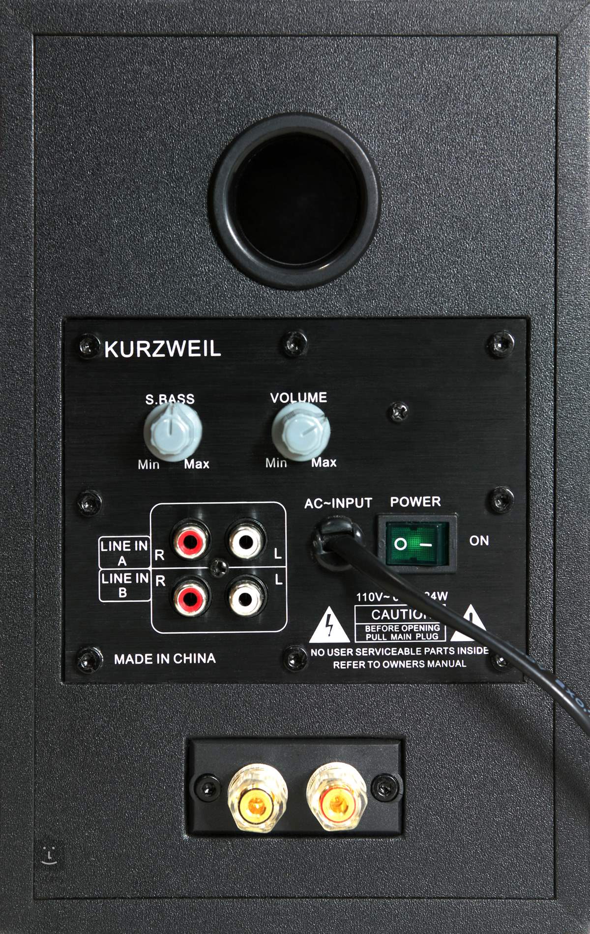 Cała elektronika ukryta jest w obudowie wykonanej z płyty MDF o grubości 12 mm. Oczywiście nie zapomniano o ekranowaniu elektromagnetycznym, strojeniu akustycznym i umieszczeniu bass reflexu z tyłu. Do wejścia służą dwie pary złącz RCA, pierwsza ze wzmocnionymi wysokimi tonami, druga z korekcją.