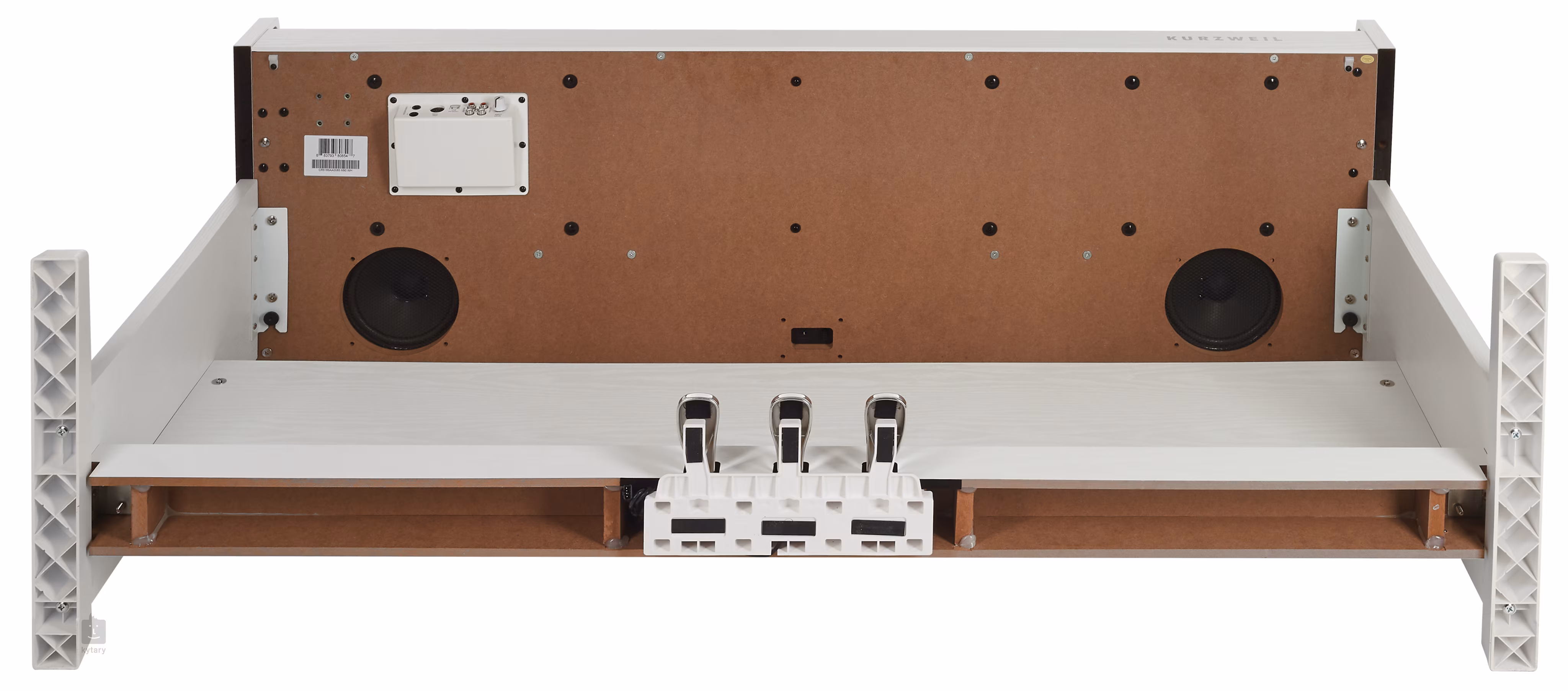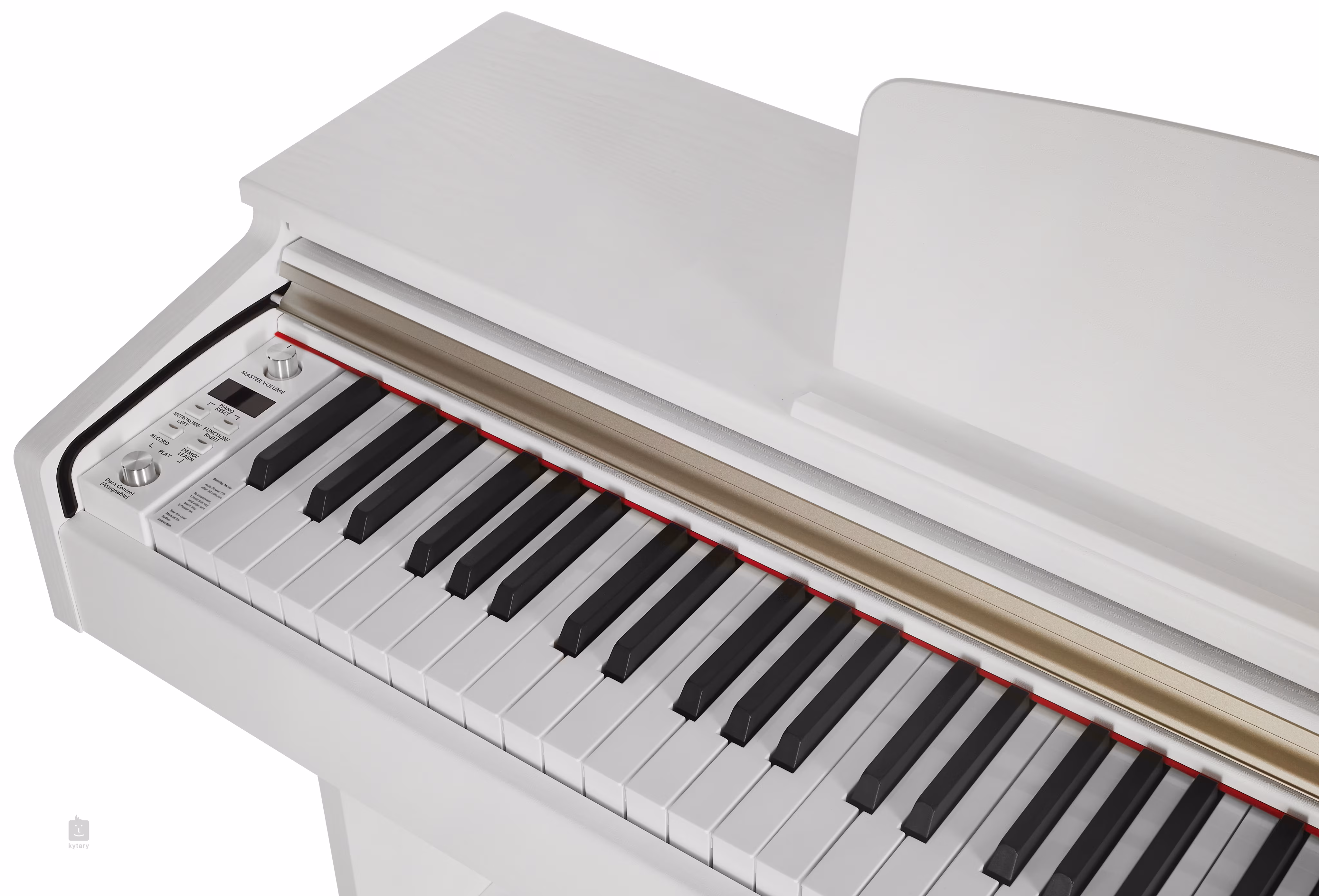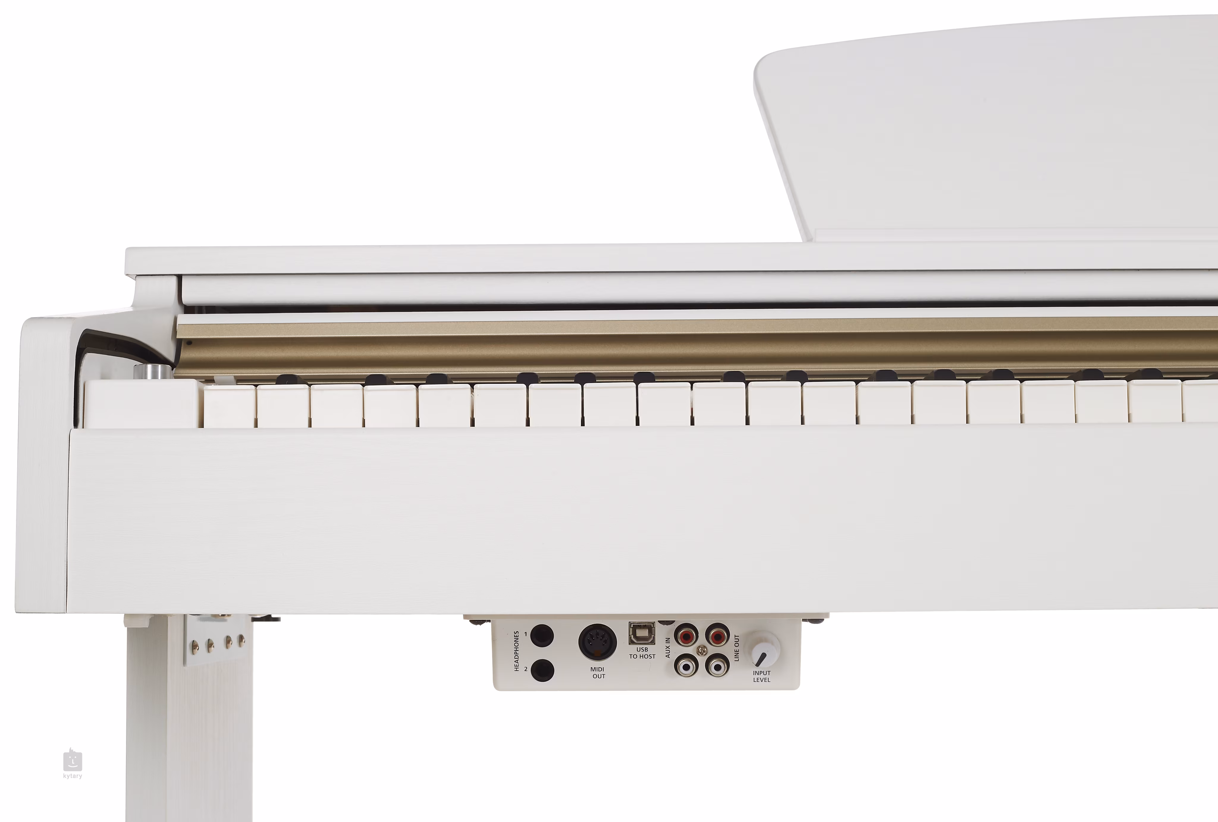Pianino cyfrowe oferuje również dwa wejścia i wyjścia liniowe RCA, kompatybilność z oprogramowaniem MIDI na komputerze za pośrednictwem kabla USB, połączenie z innymi urządzeniami MIDI za pośrednictwem złącza MIDI OUT oraz dwa wyjścia słuchawkowe do cichej i niezakłóconej praktyki. Stylowe białe wykończenie z pewnością zawstydzi Twój dom, a Twoje palce są chronione przez wsuwaną osłonę klawiatury. Do zasilania używany jest adapter 12 V. W zestawie znajduje się pedał sustain/step/soft i stołek.