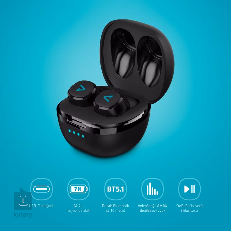 Bezprzewodowe słuchawki douszne Lamax Dots2 Play oferują do 7 godzin pracy na baterii (37 godzin z etui ładującym), Bluetooth 5.1 o zasięgu do 10 metrów, bogate basy dzięki technologii Lamax BeatBass, minimalistyczny design, złącze USB-C do podłączania innych urządzeń, wbudowany mikrofon, intuicyjne sterowanie dotykowe jednym przyciskiem do odbierania połączeń, wstrzymywania muzyki lub przełączania utworów, obsługę asystentów głosowych Siri i Google Assistant oraz czterosegmentowy wskaźnik baterii LED.