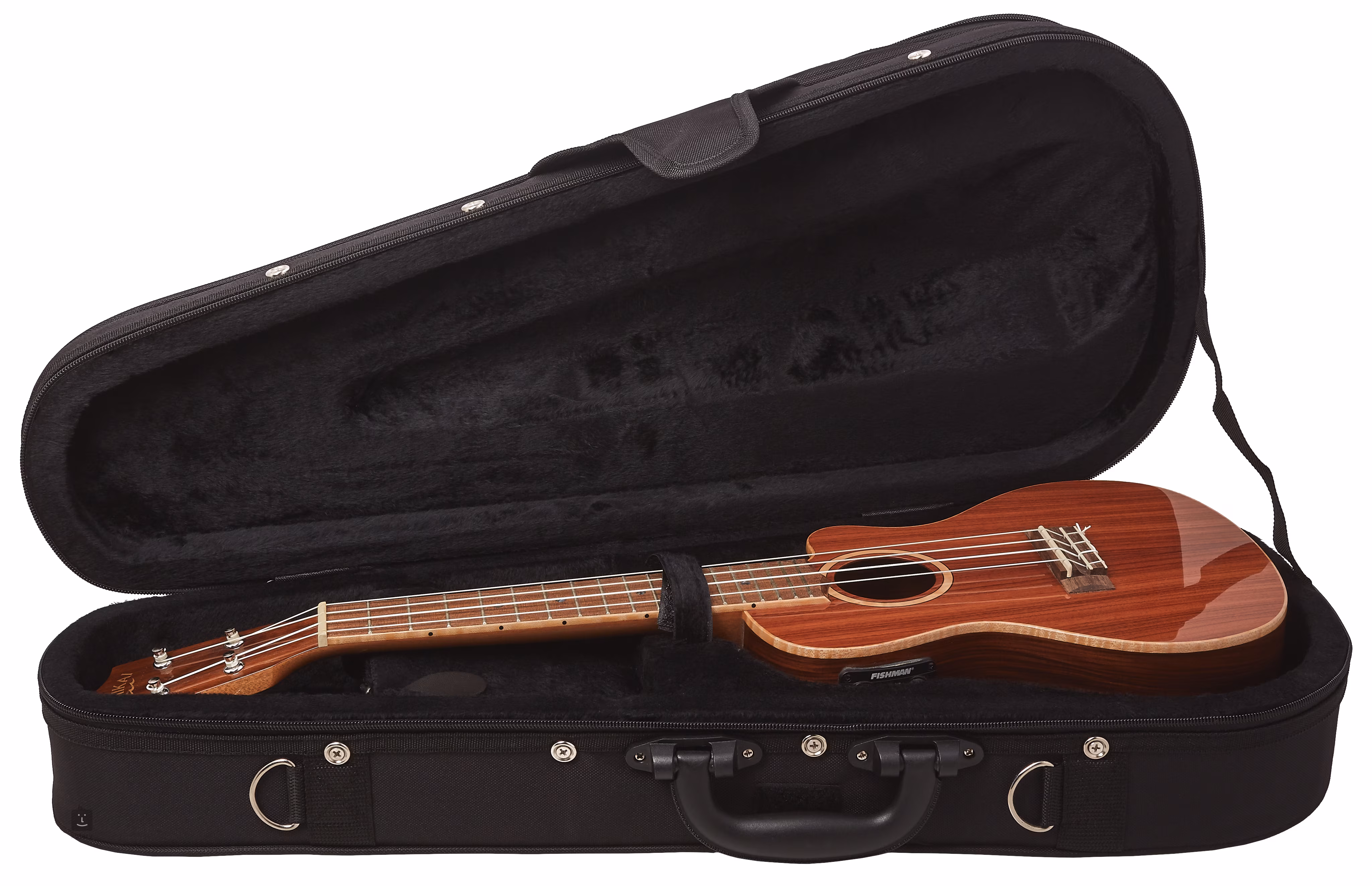 Całkowicie masywny korpus tego koncertowego ukulele wykonany jest z drewna morado (pau ferro), które nadaje instrumentowi bogate, ciepłe brzmienie z dobrą projekcją dźwięku i sustainem. Orzechowa podstrunnica wyposażona jest w osiemnaście progów ze znacznikami pozycji ułatwiającymi orientację. Szersza szyjka instrumentu i zero progów zapewniają wygodne dopasowanie i ruch podstrunnicy, a siodełko NuBone XB i zero progów zapewniają dobre podtrzymanie strun. Stabilność strojenia gwarantuje wysokiej jakości otwarty napęd Deluxe Grover z chromowanymi trzpieniami. Wrażenie wizualne podkreśla rozeta i klonowy binding, które pięknie kontrastują z kolorem korpusu instrumentu. Ukulele dostarczane jest w miękkim futerale z piankową wyściółką.