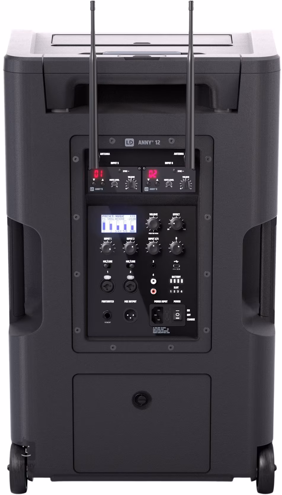 LD Systems ANNY 12 MPH2 B8 to wydajny, przenośny system nagłośnieniowy zasilany bateryjnie, wyposażony w dwa bezprzewodowe mikrofony nagłowne, który stanowi kompletne rozwiązanie do nagłośnienia imprez, prezentacji i występów bez konieczności stosowania dodatkowego sprzętu. Łączy w sobie 12-calowy aktywny głośnik o mocy 185 W RMS, zintegrowany mikser oraz aż 2 mikrofony nagłownicowe z nadajnikiem bodypack, dzięki czemu idealnie nadaje się dla moderatorów, wykładowców, trenerów sportowych lub duetów wykonawców. Maksymalny poziom ciśnienia akustycznego 122 dB SPL gwarantuje wystarczającą moc nawet w większych pomieszczeniach.