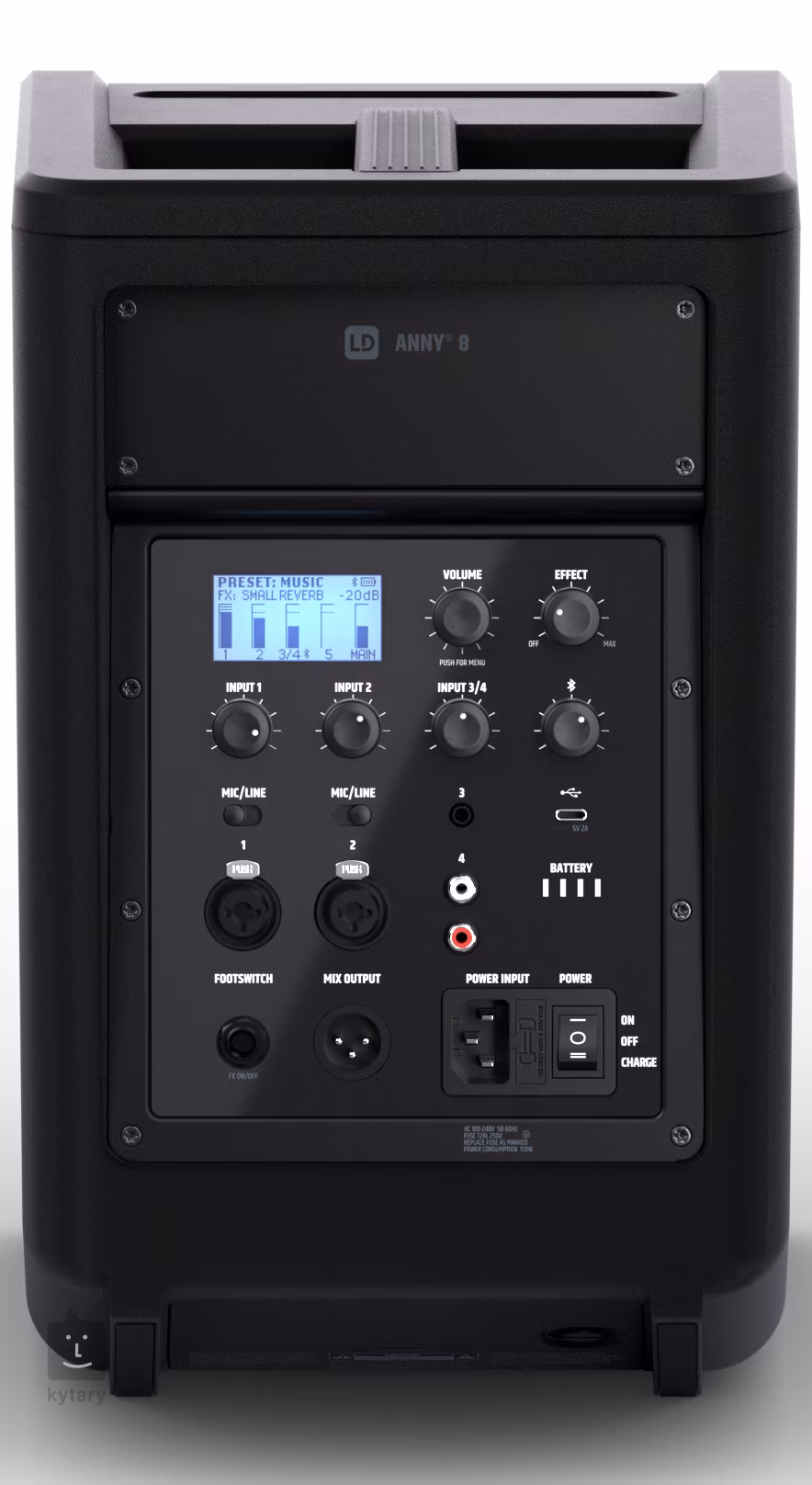 LD Systems ANNY 8 to wszechstronny głośnik mobilny, który pozwala ożywić występy muzyczne, przemówienia lub wykłady w dowolnym miejscu bez kompromisów w zakresie dźwięku. Wszystko dzięki zasilaniu bateryjnemu i wbudowanej konsoli mikserskiej z korektorem i efektami pogłosu lub łączności bezprzewodowej. Opcje audio Wysokowydajny kompaktowy głośnik wyposażony jest w 8-calowy głośnik niskotonowy i 1-calowy głośnik wysokotonowy ze wzmacniaczem końcowym DynX® DSP, który optymalizuje i zapewnia niezakłóconą wydajność nawet przy najwyższych poziomach głośności. Nie tylko wymagający użytkownicy będą zadowoleni ze zintegrowanego 6-kanałowego miksu z kilkoma wstępnie ustawionymi krzywymi EQ oraz efektami pogłosu i opóźnienia. Dzięki dużej różnorodności złączy, do ANNY można podłączyć praktycznie wszystko, w tym dwa mikrofony, kilka sygnałów liniowych i wreszcie bezprzewodowy interfejs Bluetooth 5.0 z kodekiem AAC i funkcją strumieniowania stereo (TWS) na wypadek, gdybyś chciał użyć dwóch głośników ANNY do prawdziwej reprodukcji stereo. Głośniki w szczególności docenią funkcję priorytetu/duckingu, która automatycznie tłumi akompaniament muzyczny i pozwala wyróżnić głos. Długa żywotność Dzięki energooszczędnemu ustawieniu ECO, ANNY może działać do 11 godzin przy średniej głośności. Wydłużony czas pracy jest możliwy dzięki opcjonalnym bateriom zapasowym. Dzięki złączu USB-C na tylnym panelu można również ładować telefon komórkowy lub tablet, do którego dołączona jest poręczna podstawka. Zestawy bezprzewodowe i opcjonalne akcesoria Głośniki ANNY 8 można wyposażyć w opcjonalny moduł bezprzewodowego odbiornika FM ANNY R, który odbiera sygnały z odległości do 80 m od mikrofonów ręcznych ANNY MD lub bodypacków ANNY BP (z mikrofonem nagłownym). Wszystkie akcesoria bezprzewodowe można nabyć oddzielnie, jednak seria ANNY obejmuje kilka wygodnych konfiguracji bezprzewodowych, które można znaleźć w naszym sklepie. Dostępna jest wodoodporna torba transportowa chroniąca przed deszczem, a zakup zapasowego akumulatora nie będzie błędem.