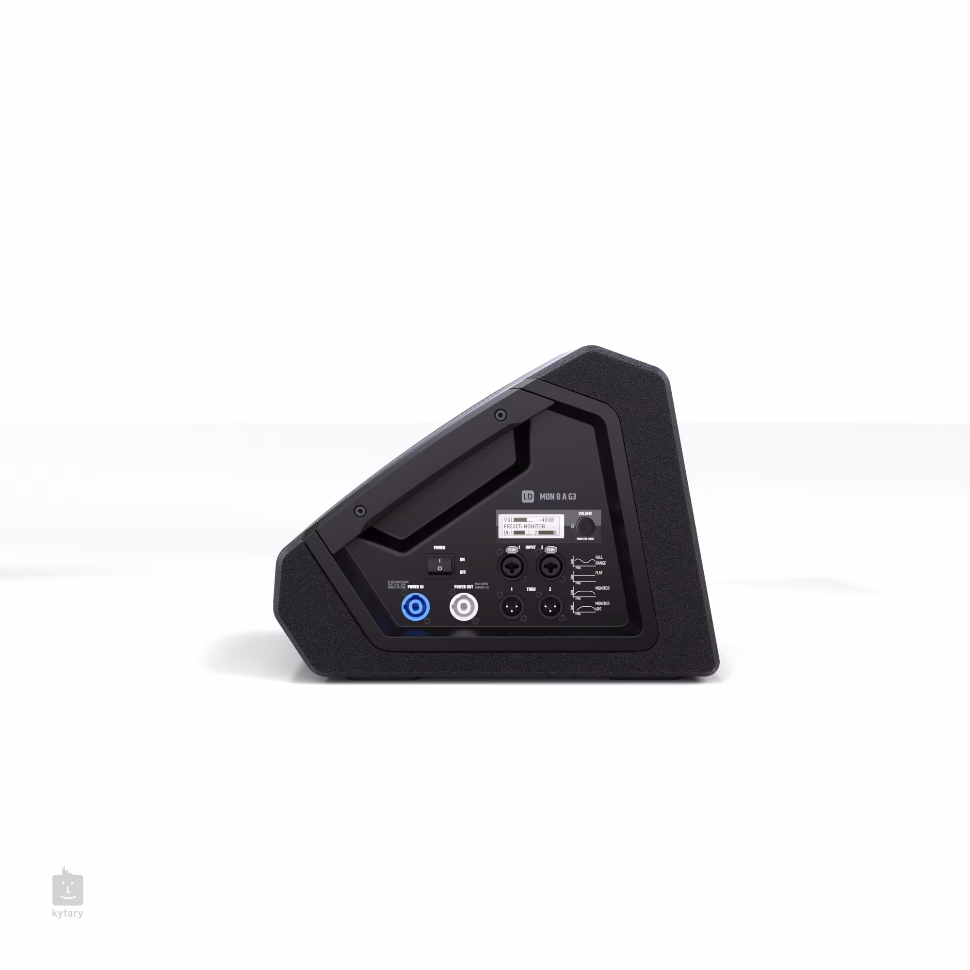 LD Systems MON 8 A G3 to dwupasmowy aktywny głośnik estradowy o konstrukcji współosiowej, maksymalnej mocy wyjściowej 1200 W (300 W RMS) wzmacniacza klasy D, paśmie przenoszenia (-10 dB: 59 Hz - 20 kHz, -3 dB: 68 Hz - 18 kHz), 33-stopniowym nachyleniu monitora, projekcji dźwięku przestrzennego 50 x 90 stopni, trzypasmowym korektorze, filtrze notch i funkcji opóźnienia. Konfiguracja koncentryczna zapewnia mniejszą podatność na efekty sprzężenia zwrotnego. MON 8 A G3 może być również zamontowany na standardowych statywach głośnikowych (gniazdo 35 mm) - służąc jako głośnik sceniczny, na statywie jako głośnik FOH lub jako satelita w systemach 2.1.