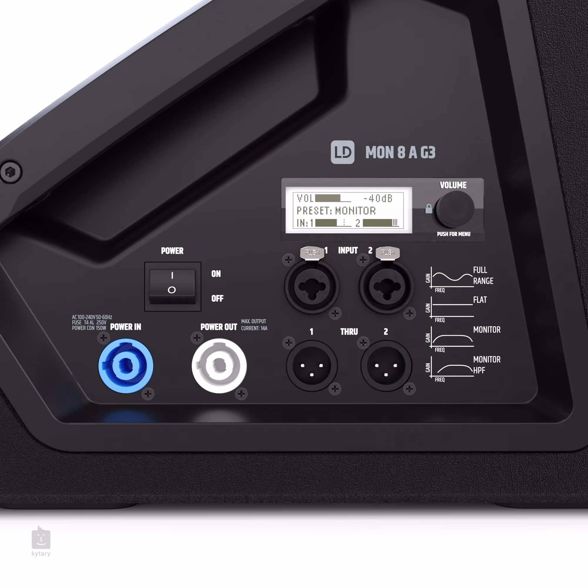 LD Systems MON 8 A G3 to dwupasmowy aktywny głośnik estradowy o konstrukcji współosiowej, maksymalnej mocy wyjściowej 1200 W (300 W RMS) wzmacniacza klasy D, paśmie przenoszenia (-10 dB: 59 Hz - 20 kHz, -3 dB: 68 Hz - 18 kHz), 33-stopniowym nachyleniu monitora, projekcji dźwięku przestrzennego 50 x 90 stopni, trzypasmowym korektorze, filtrze notch i funkcji opóźnienia. Konfiguracja koncentryczna zapewnia mniejszą podatność na efekty sprzężenia zwrotnego. MON 8 A G3 może być również zamontowany na standardowych statywach głośnikowych (gniazdo 35 mm) - służąc jako głośnik sceniczny, na statywie jako głośnik FOH lub jako satelita w systemach 2.1.