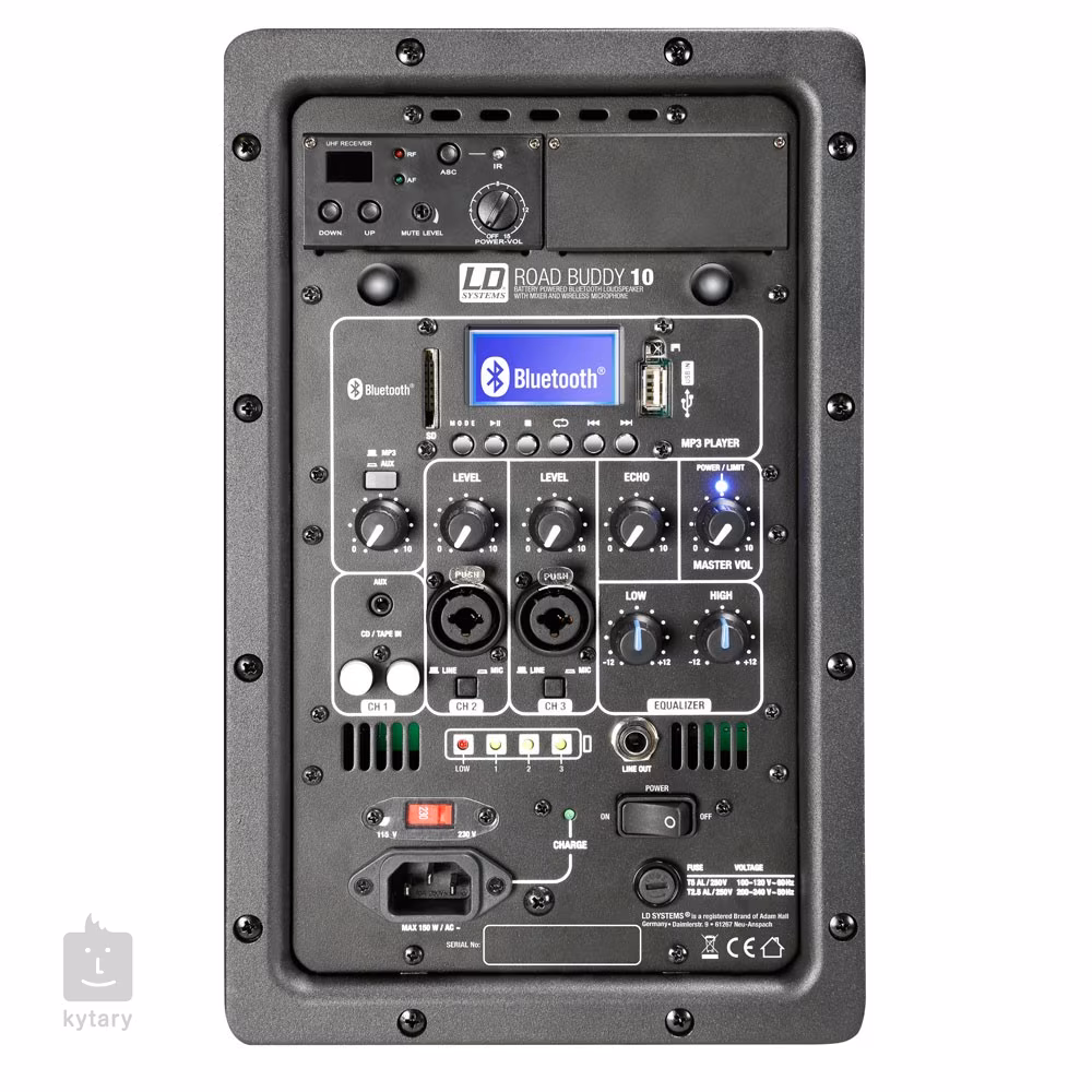 W przypadku urządzeń przewodowych Roadbuddy ma dwa kanały z gniazdami combo XLR/Jack 6,3 mm i indywidualnymi regulatorami głośności, które można przełączać na poziom mikrofonowy i liniowy, wejście stereo można podłączyć za pomocą gniazd RCA (Cinch) i wejścia Aux Jack 3,5 mm. Panel sterowania uzupełniają regulatory tonów wysokich, niskich, echa i głośności głównej.