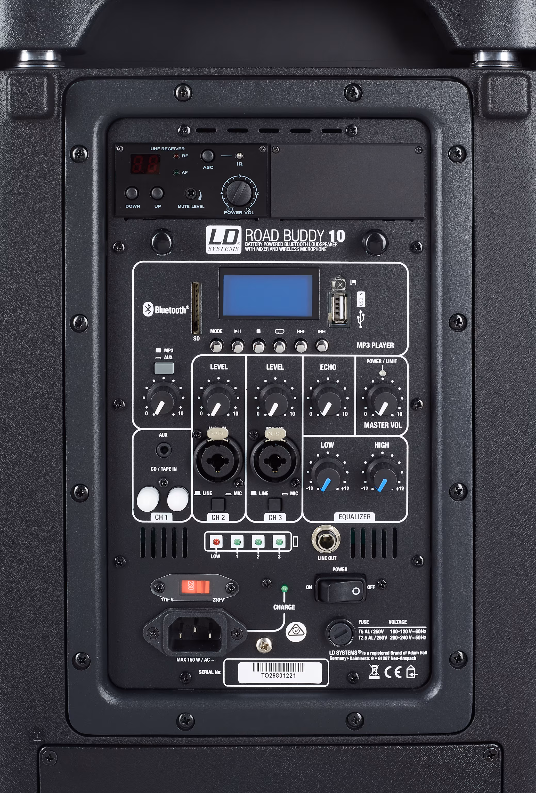LD Systems Roadbuddy 10 to eleganckie rozwiązanie do odtwarzania głosu i muzyki w podróży. Dwudrożny głośnik jest wyposażony w specjalny 10-calowy głośnik niskotonowy i 1-calowy przetwornik kompresyjny. Wzmacniacz mocy klasy D z wysokowydajnym zasilaczem impulsowym i mocą szczytową 480 W jest zasilany akumulatorem o żywotności do 8 godzin.Roadbuddy 10 B6 w pełni opiera się na transmisji bezprzewodowej. Jest wyposażony w odbiornik radiowy UHF, który działa w paśmie 655–679 MHz i można go rozszerzyć o kolejny system. Wbudowany odtwarzacz Bluetooth z podświetlanym wyświetlaczem wielofunkcyjnym, korektorem, portem USB i gniazdem kart SD obsługuje formaty mp3, wma i wav. W zestawie znajduje się mikrofon ręczny o mocy wyjściowej 10 mW (LDRBUD10B5) lub alternatywnie mikrofon nagłowny (LDRBUD10HSB5) oraz pilot zdalnego sterowania odtwarzaczem na podczerwień. W przypadku urządzeń przewodowych Roadbuddy oferuje dwa kanały z combo złączami XLR / Jack 6,3 mm i indywidualnymi regulatorami głośności, które można przełączać między poziomem mikrofonowym i liniowym. Wejście stereo można podłączyć za pomocą gniazd RCA (Cinch) i Jack 3,5 mm Aux. Panel sterowania uzupełniają regulatory głośności Treble, Bass, Echo i Master. LD Systems Roadbuddy jest łatwy do przenoszenia dzięki wbudowanym kółkom i wysuwanej rączce. W górnej części znajduje się praktyczny schowek na maksymalnie dwa ręczne mikrofony nadawcze. Obudowa tego lekkiego urządzenia została zaprojektowana tak, aby pomieścić nawet 35 mm otwór na statyw.