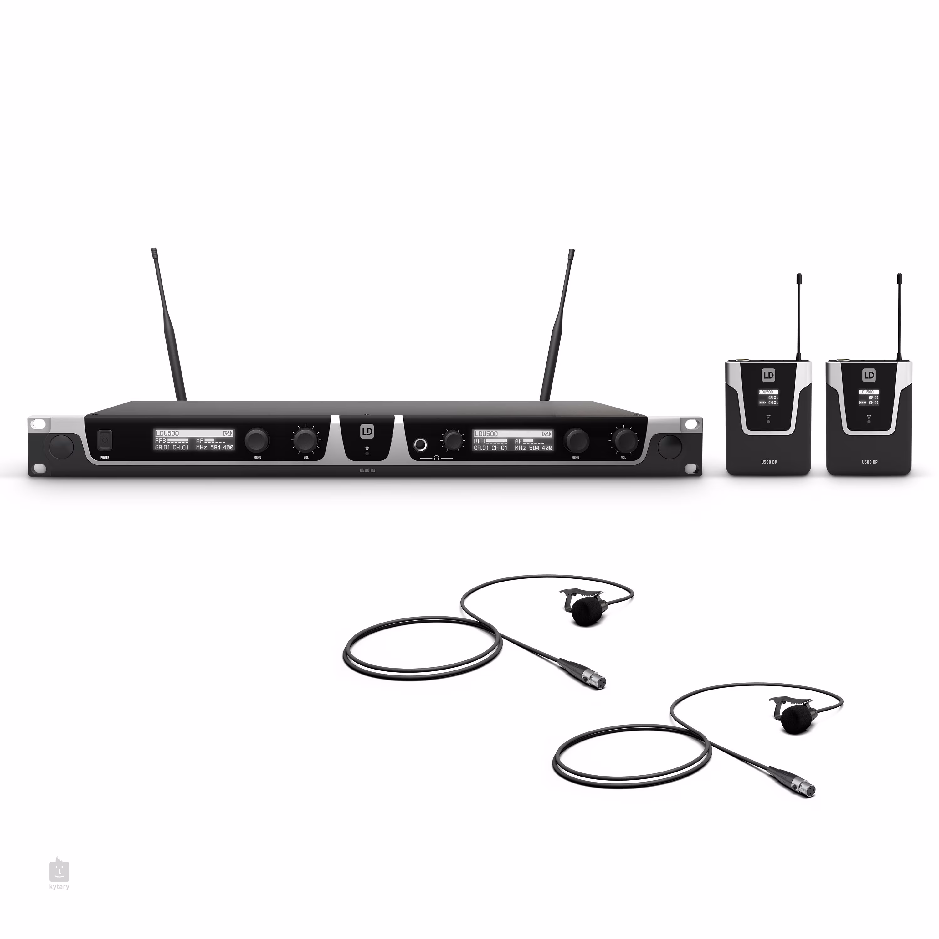 Zestaw zawiera odbiornik, 2 nadajniki bodypack, 2 mikrofony klapowe, adapter, osłonę przeciwwiatrową i uchwyty rack.