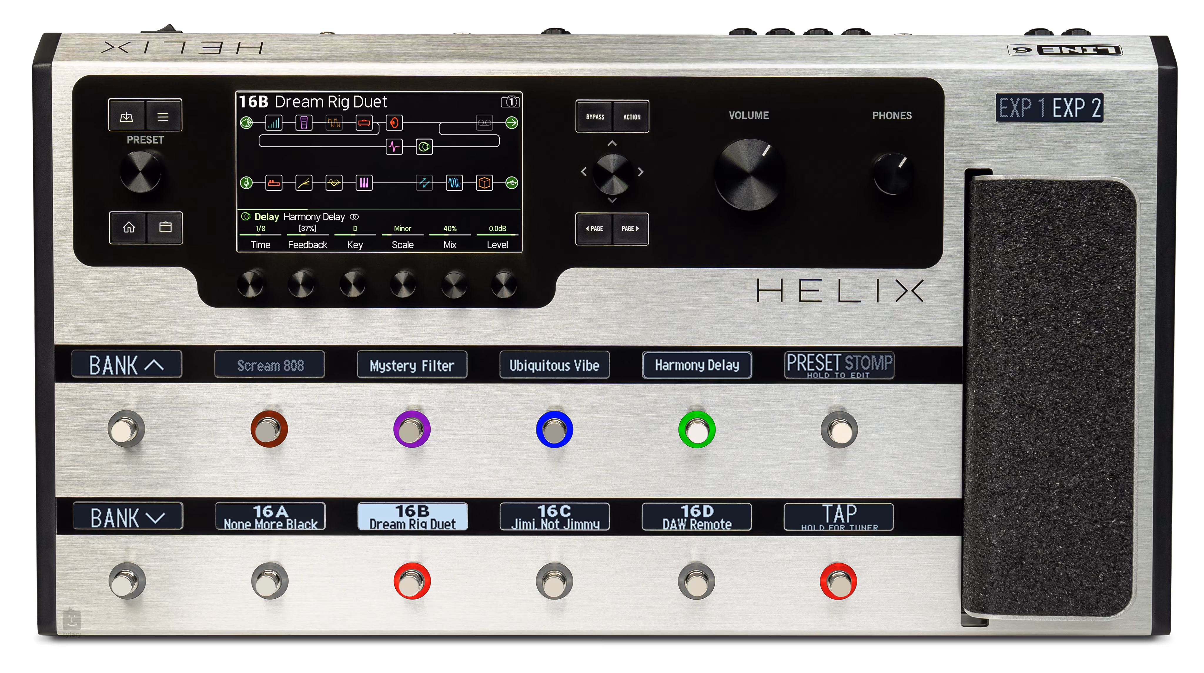Jednym z celów przy opracowywaniu Helixa było umożliwienie gitarzystom połączenia się z technologią w znacznie bardziej intuicyjny sposób, aby jeszcze łatwiej tworzyć brzmienie. Oznacza to, że po raz pierwszy nie musisz przerywać gry, aby przekręcić pokrętło. W trybie Pedal Edit Mode możesz edytować różne parametry za pomocą przycisków nożnych: po prostu wybierasz blok, który chcesz edytować, a jego parametry są automatycznie przypisywane do każdego przycisku nożnego. Wybierasz parametr i ustawiasz jego wartość za pomocą pedału ekspresji.