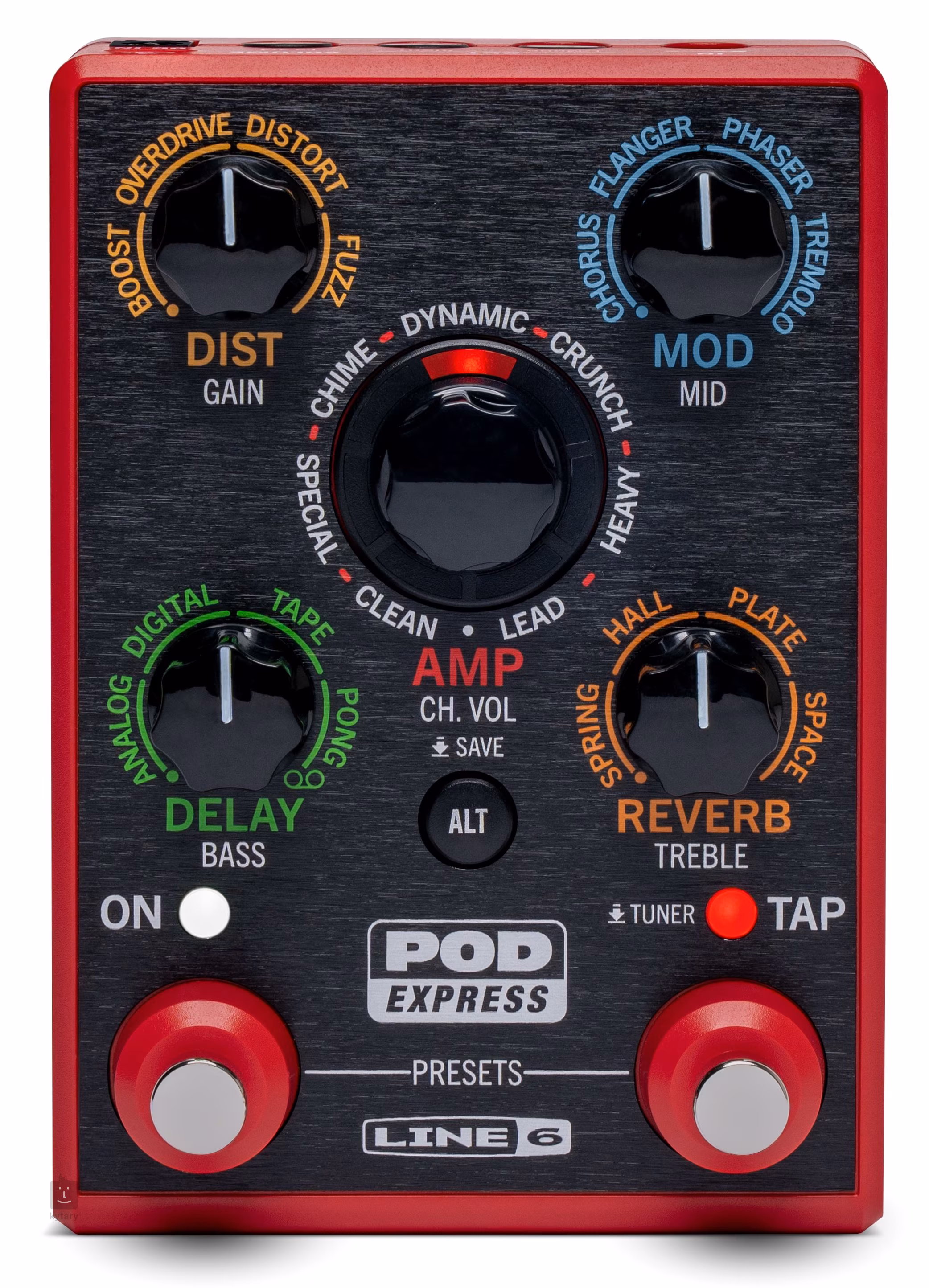 POD Express Guitar oferuje maksymalnie prosty i intuicyjny interfejs użytkownika, który ułatwia dostrojenie dźwięku. Posiada dwa przełączniki nożne do przełączania między efektami i kontrolowania funkcji tap tempo. Pięć pokręteł ułatwia wybór preferowanego instrumentu i ustawienie wszystkich efektów. Przytrzymaj przycisk Alt, aby uzyskać dostęp do dodatkowych funkcji w celu bardziej szczegółowej regulacji dźwięku (Gain, Mid, Bass, Treble). Jeśli panel sterowania skrzynki nie jest dla Ciebie wystarczający, możesz pobrać bezpłatne oprogramowanie Pod Express Edit, które zapewnia zaawansowane opcje konfiguracji. Pudełko zawiera 21 presetów fabrycznych, które można oczywiście nadpisać presetami użytkownika.
