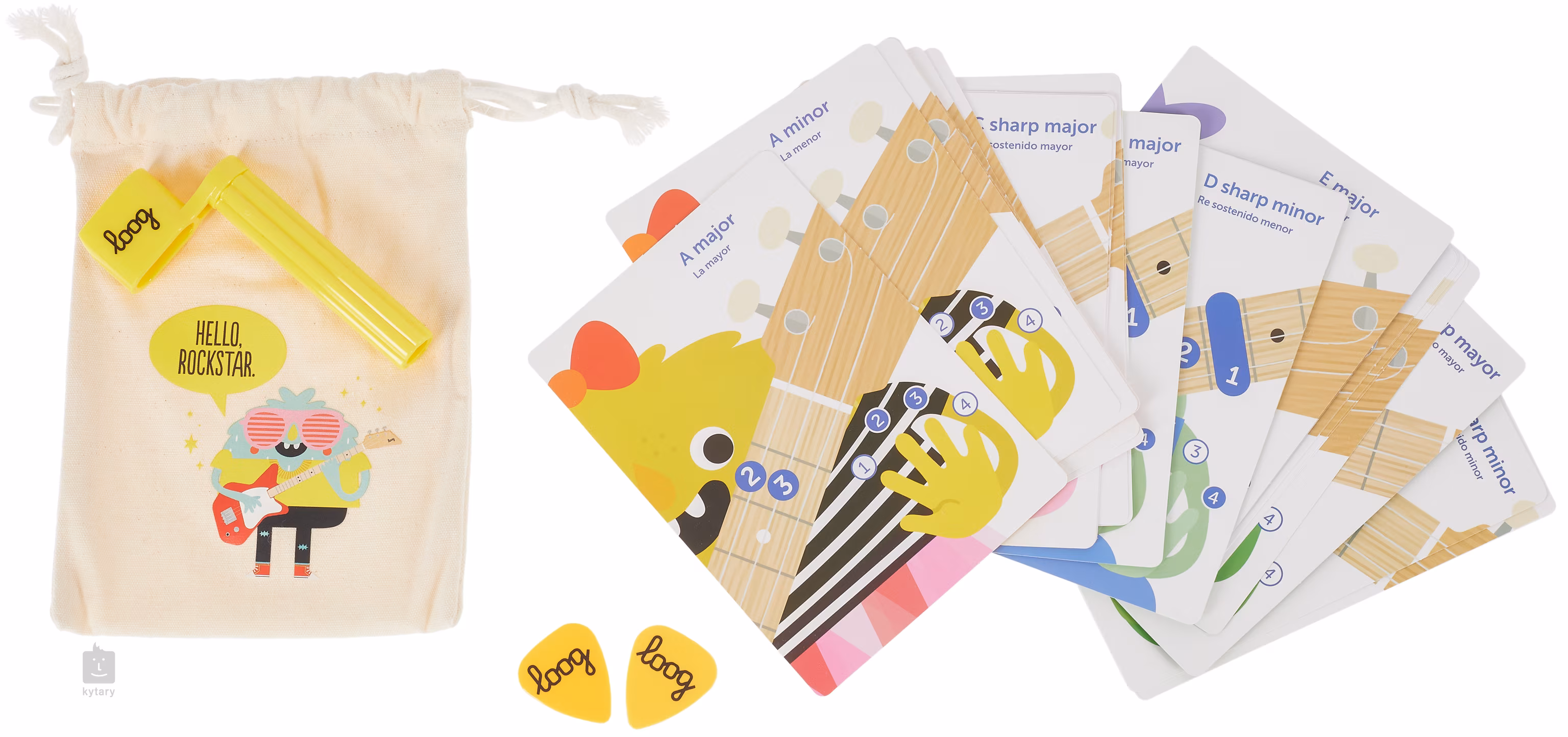 W zestawie znajdują się karty akordów, kostki i link do pobrania bezpłatnej aplikacji Loog Guitar, która zapewnia dostęp do lekcji wideo, tunera i cyfrowego śpiewnika. Twoje dzieci nauczą się piosenek Beatlesów, Stonesów, Taylor Swift i innych artystów w uproszczonej aranżacji na trzystrunową gitarę dziecięcą.