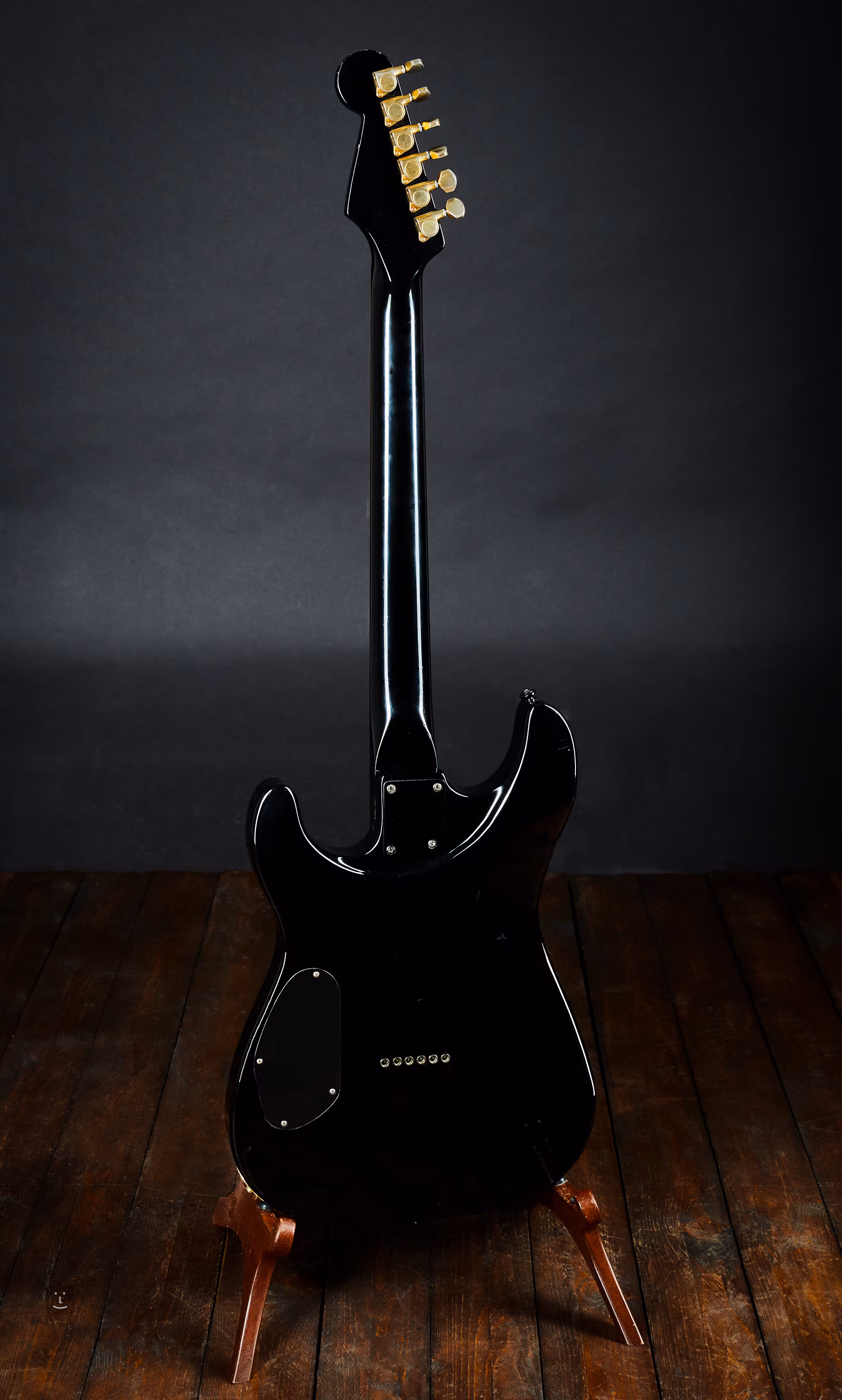 Czarny instrument jest oparty na stratocasterze, ale ma łukowaty top, parę przetworników humbucker i solidny mostek ze strunami przechodzącymi przez korpus.