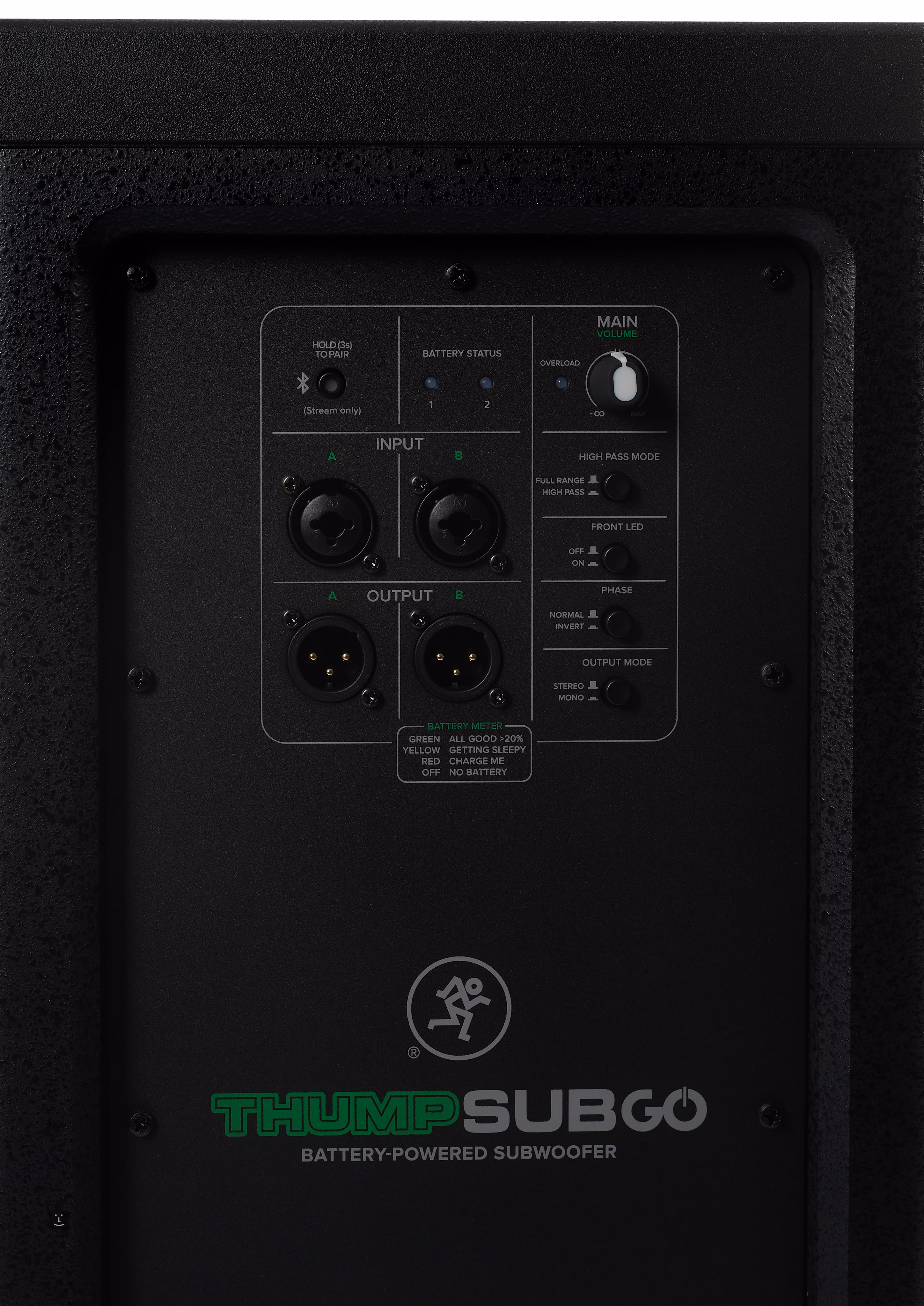 Mackie ThumpSub GO jest wyposażony w dwa 8-calowe głośniki niskotonowe i wysokiej jakości wzmacniacz klasy D o mocy do 400 W. Dzięki temu jest w stanie wytworzyć gęste i przebijające basy, które są niezbędne do wysokiej jakości odtwarzania nowoczesnych gatunków muzycznych. Subwoofer jest wyposażony w dwa gniazda na baterie, które łącznie zapewniają do 12 godzin ciągłej pracy. Przy użyciu jednej baterii czas pracy jest o połowę krótszy (w zestawie znajduje się tylko jedna bateria, drugą należy dokupić osobno).