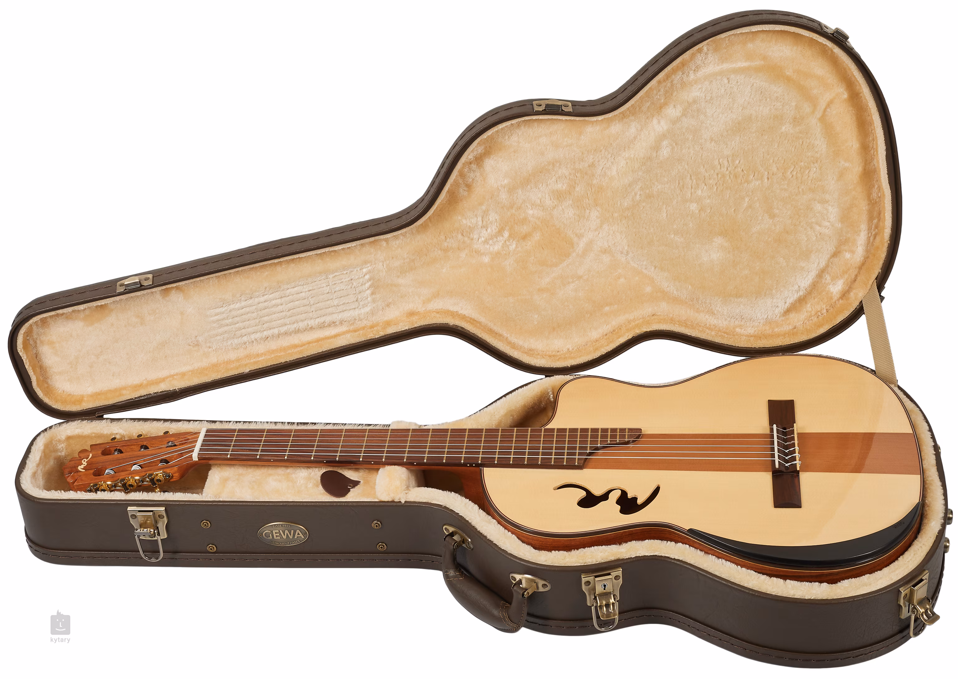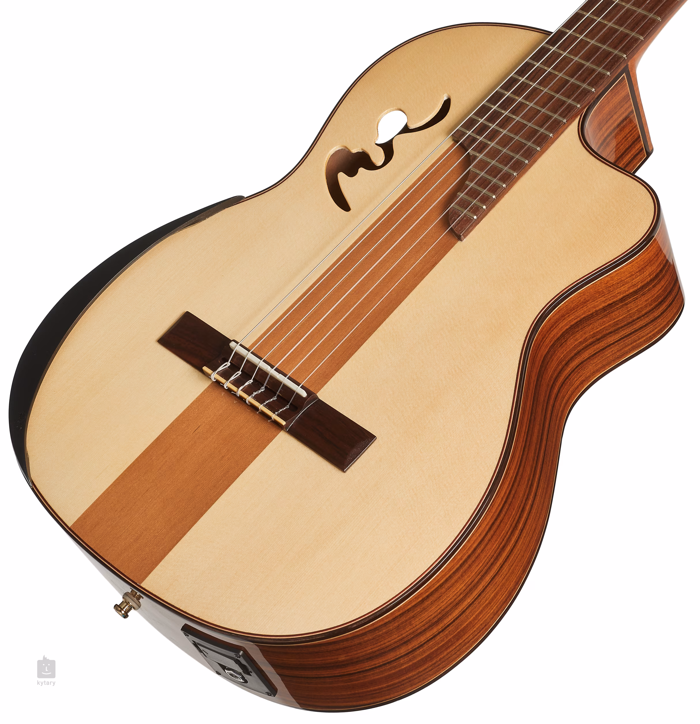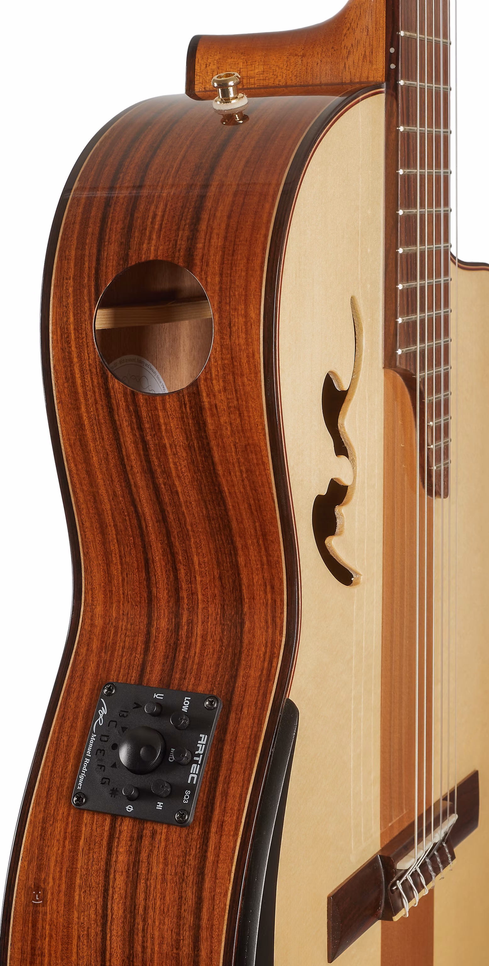 Manuel Rodriguez Café Cortado to klasyczna gitara elektroakustyczna o nowoczesnym designie. Przód gitary składa się z litego świerku, a środkowa część z cedru, tył i boki wykonane są z laminowanego drewna pau ferro z charakterystycznym wzorem. Płyta przednia ozdobiona jest błyszczącym lakierem i nietypowo umieszczonym otworem rezonansowym w kształcie podpisu mistrza gitary. Drugi otwór (port dźwiękowy) z tyłu pozwala lepiej dostrzec i usłyszeć czyste, akustyczne brzmienie instrumentu.