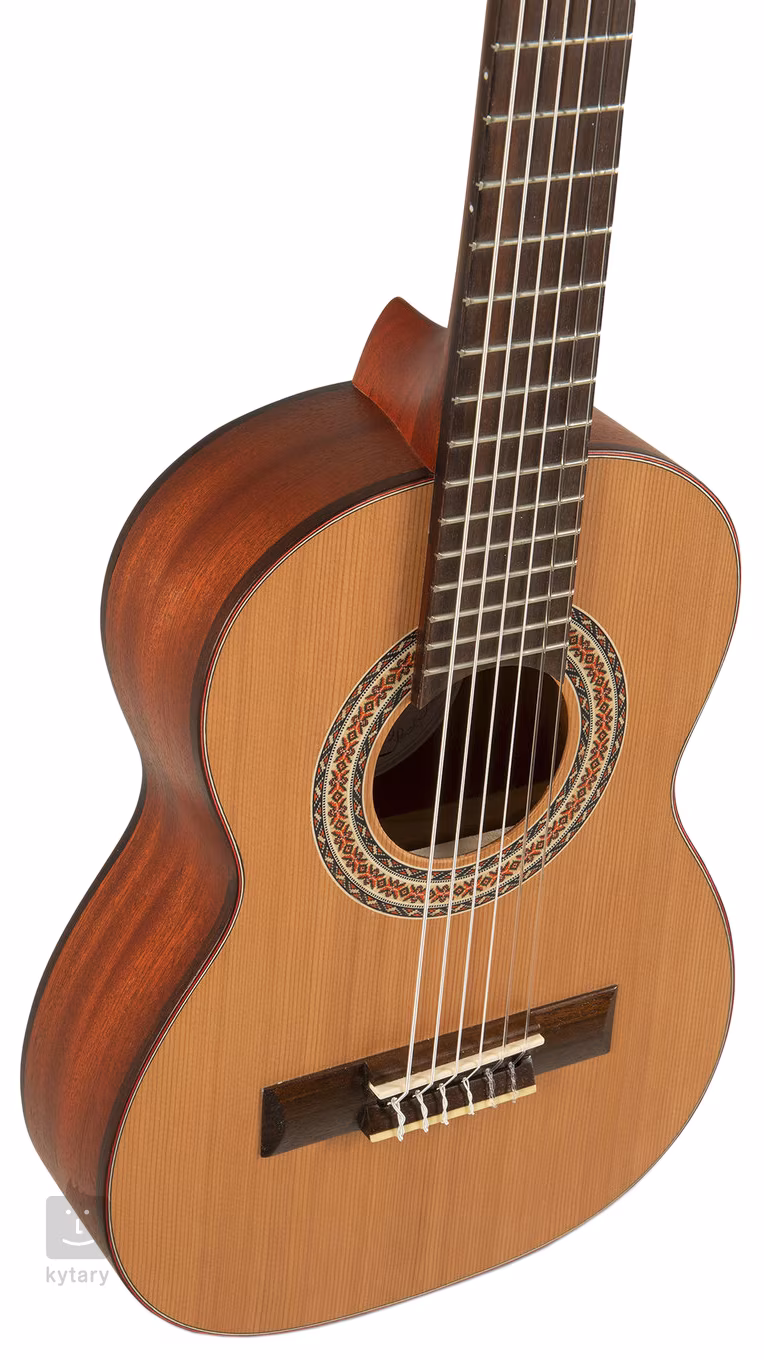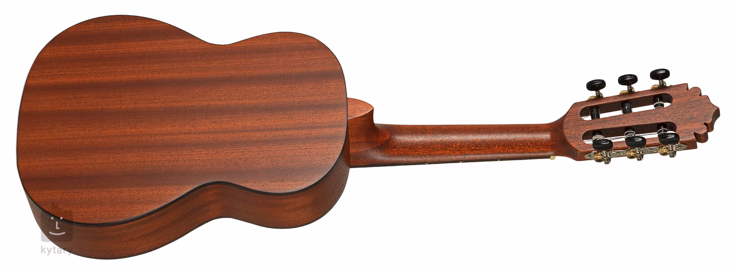 TRADICÍON Series T-44 1/4 size to dziecięca gitara klasyczna w rozmiarze 1/4. Front instrumentu wykonany jest z litego czerwonego cedru, natomiast tył i boki z laminowanego mahoniu. Gitara posiada również mahoniową szyjkę, podstrunnicę i palisandrową owijkę ovangkol, zerową intarsję podstrunnicy i podstrunnicy wykonaną z syntetycznego materiału bonoidalnego z dużą zawartością szkła (podobnego do materiału TusQ), wyprodukowane w Holandii maszynki do strojenia Van Gent z czarnymi kołkami oraz tradycyjne elementy w postaci klonowej podstrunnicy, ozdobnej rozety i mahoniowego forniru na główce.
