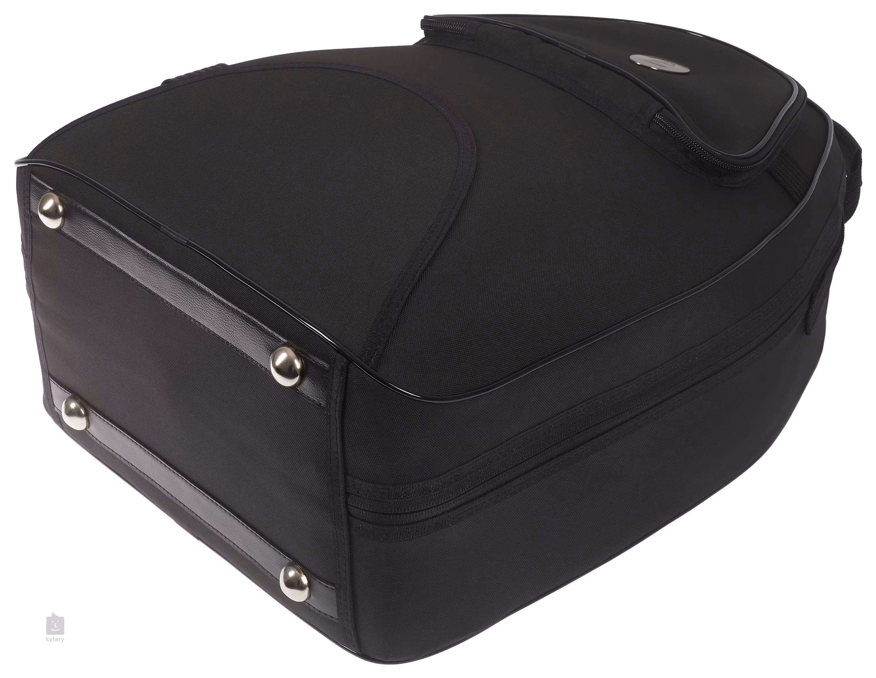 Miękki futerał na waltornię z wyjmowanym pulpitem akustycznym firmy Marcus Bonna wykonany z trwałego tworzywa sztucznego. Wyściełane wnętrze futerału oferuje wzmocnioną ochronę samego instrumentu oraz dwie oddzielne przegrody do przechowywania dławików. W dwóch zewnętrznych kieszeniach zapinanych na zamek błyskawiczny można przechowywać nuty i inne drobne akcesoria. Do przenoszenia walizki służą dwa uchwyty lub dwa odpinane, wyściełane paski na ramię.