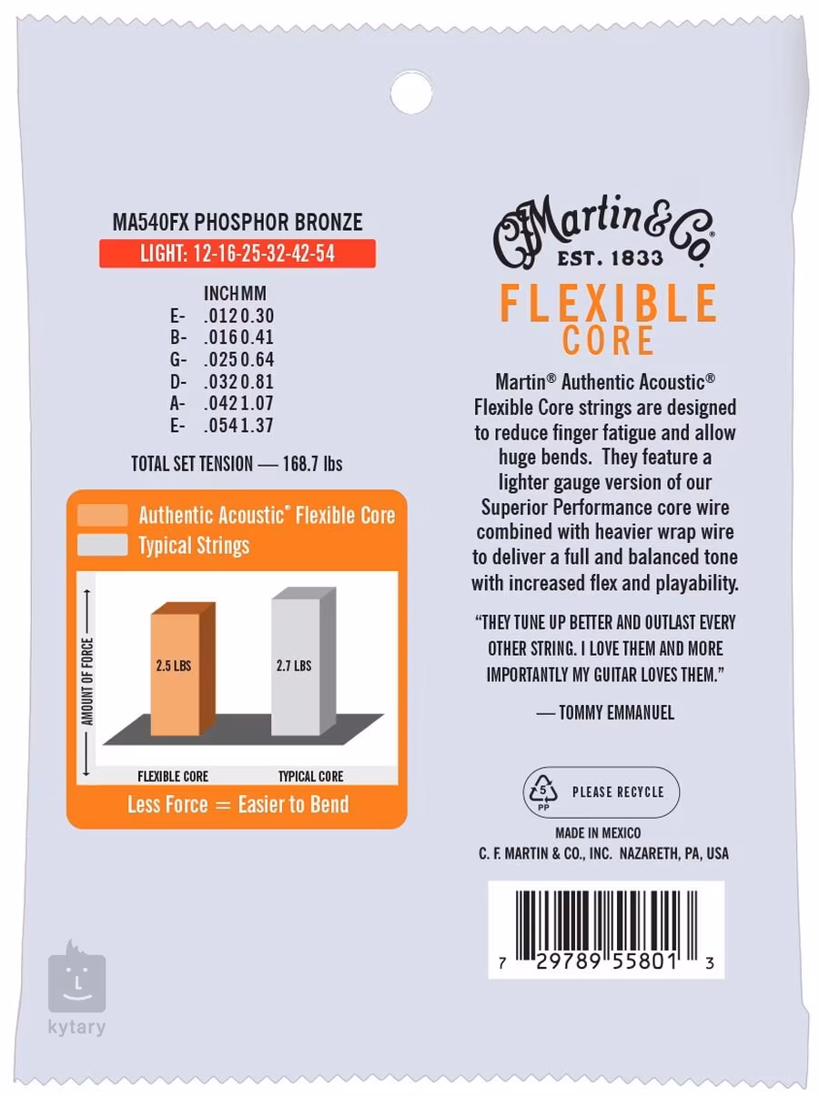 Struny do gitary akustycznej Martin Tommy’s Choice należą do serii Flexible Core, która kładzie nacisk na elastyczność i giętkość strun. Ich rdzeń wykonany jest z niezwykle cienkich drutów, co zapewnia wyjątkową sprężystość, nie wpływając jednak nadmiernie na ich napięcie i brzmienie. Efektem jest komfort gry i absolutna kontrola nad zachowaniem struny. Jeśli chcesz grać jak Tommy Emmanuel lub wykonywać bendy w stylu Davida Gilmoura, ten zestaw z pewnością warto wypróbować. Podstawą strun jest cynowany rdzeń stalowy owinięty na strunach basowych stopem fosforowego brązu, co nadaje im ciepły i pełny charakter brzmienia.