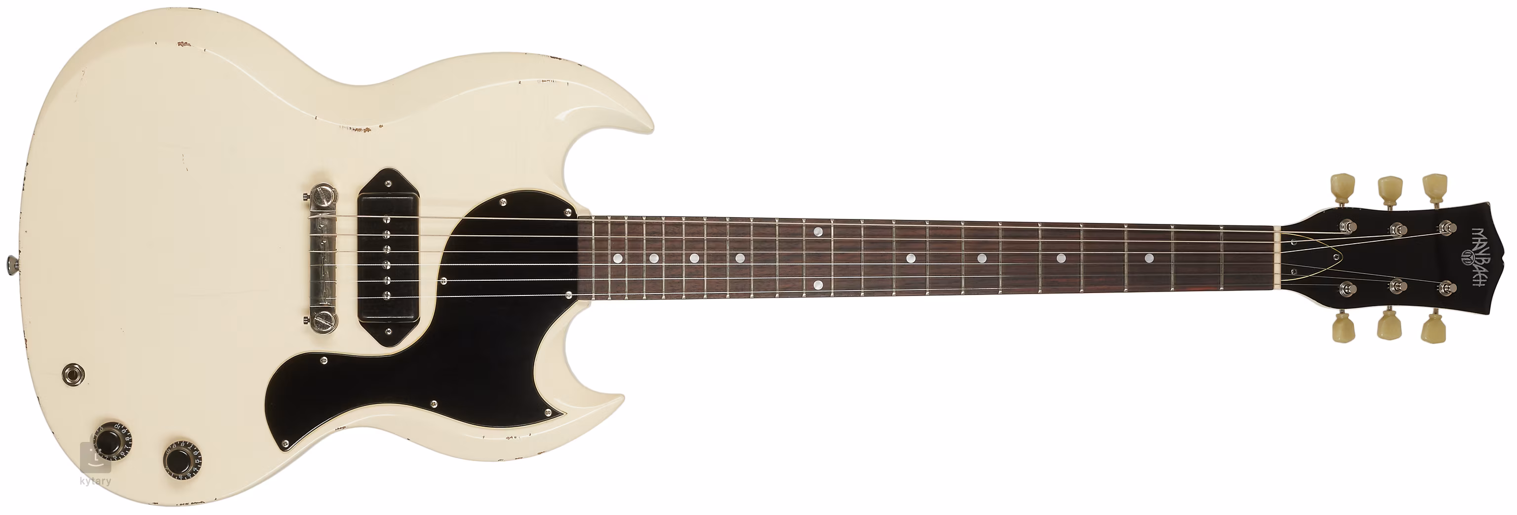 Maybach Albatroz '65 Vintage Cream Aged to gitara elektryczna typu SG double cut, która oferuje wszystkie klasyczne elementy kojarzone z tym instrumentem - lekki mahoniowy korpus z płaskim topem, dwoma wycięciami i wyprofilowanymi krawędziami, mahoniową szyjkę i palisandrową podstrunnicę z dwudziestoma dwoma progami Medium Jumbo.
