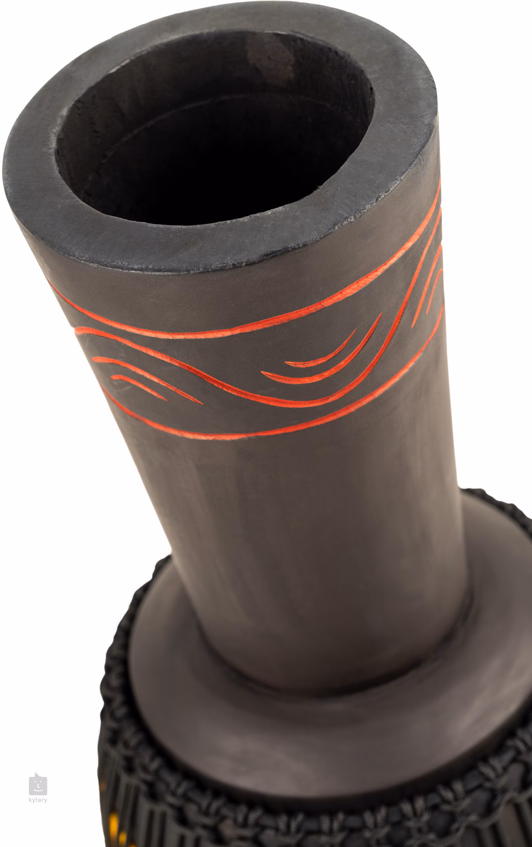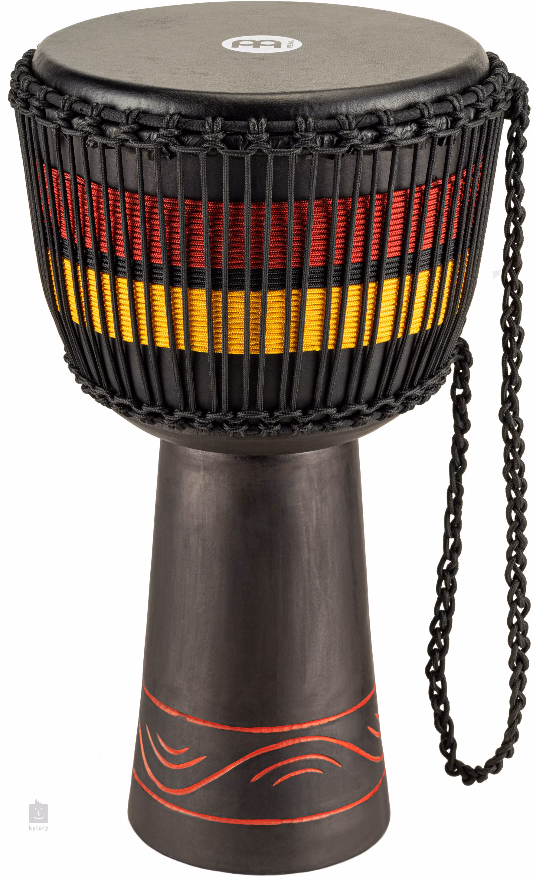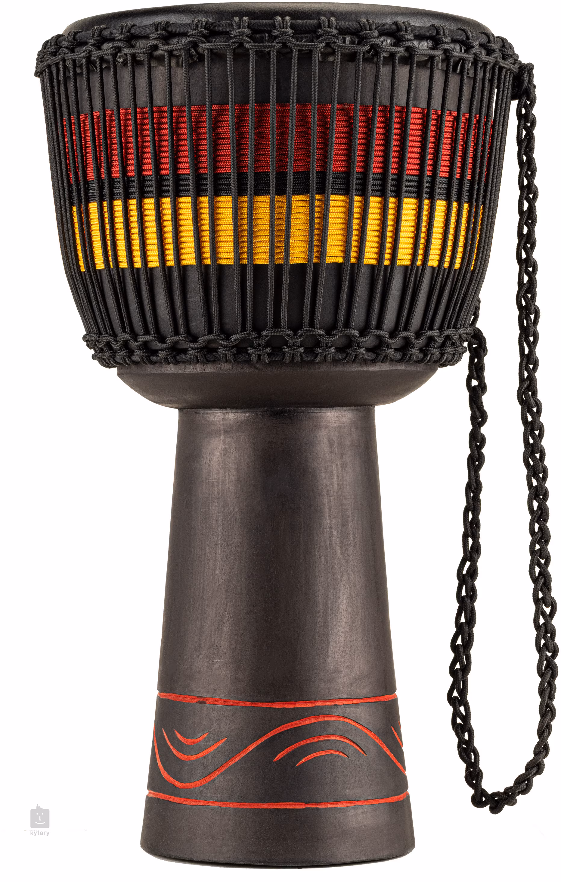 Jakość brzmienia dopełnia ręcznie dobrana koźla skóra, która zapewnia ciepły, łagodniejszy atak z długim i głębokim wybrzmieniem. O precyzyjne i stabilne strojenie dba tradycyjny system strunowy z 35 pionowymi prowadnicami. Zastosowano wstępnie napięte nylonowe sznury HTP (High Tensile Polymer) o grubości 5 mm, które niezawodnie utrzymują napięcie nawet w trudnych warunkach klimatycznych. Instrument przyciąga również swoim wyglądem – czarny korpus zdobią ręcznie wykonane ornamentalne rzeźbienia oraz kolorowe oploty sznurów, które podkreślają jego wyjątkowy charakter.
