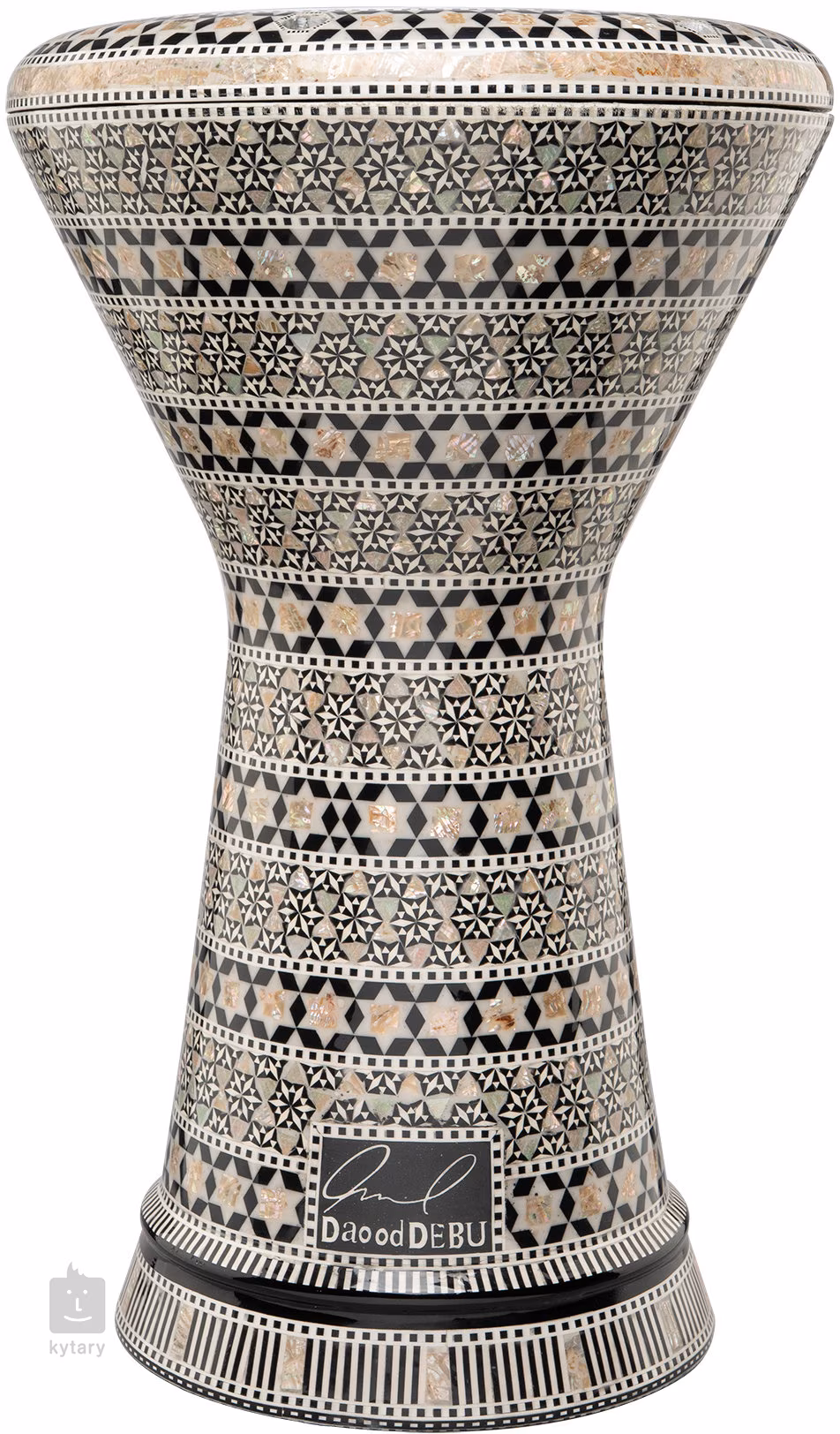 Korpus doumbeka jest wykonany z wytrzymałego aluminium, które zapewnia stabilność, długą żywotność i jasny, przenikliwy ton. Bogato zdobiona powierzchnia z ręcznie wykonaną mozaiką z masy perłowej nadaje instrumentowi luksusowy wygląd, a jednocześnie nawiązuje do tradycyjnej estetyki Bliskiego Wschodu. Każdy egzemplarz jest wyjątkowym dziełem sztuki, które przyciąga nie tylko brzmieniem, ale także wyglądem.