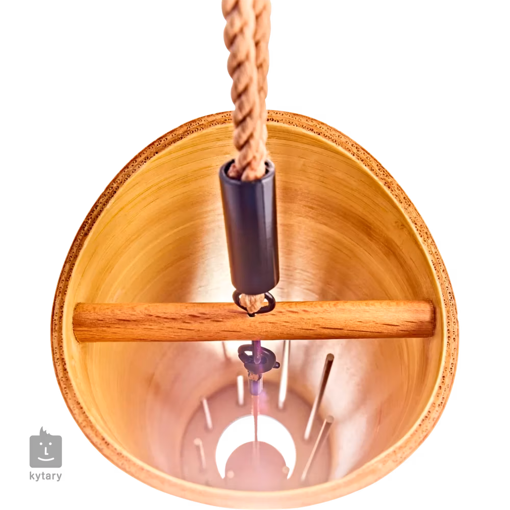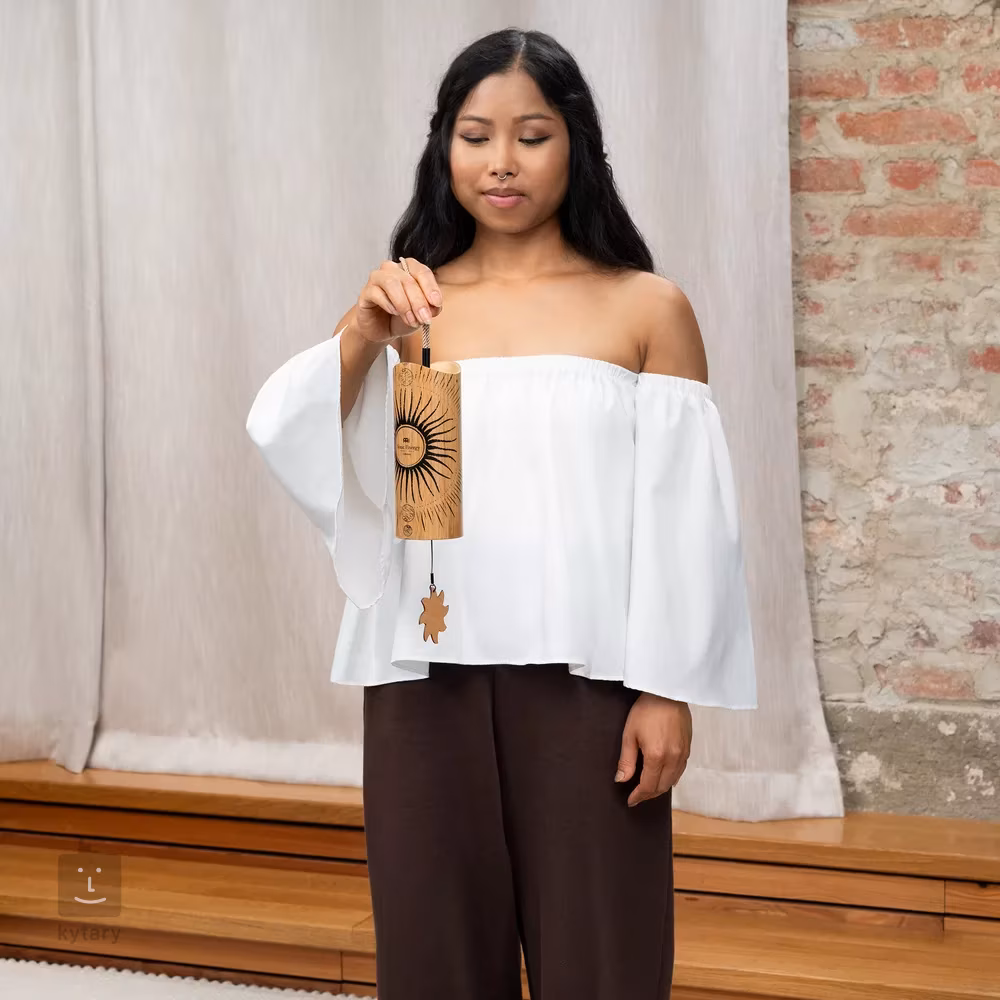 Meinl Sonic Energy Cosmic Bamboo Chimes to instrument, który wytwarza delikatne rezonujące tony, które wypełniają przestrzeń spokojnym dźwiękiem. Są idealne do medytacji, kąpieli dźwiękowych i jogi lub mogą być używane do stworzenia relaksującej przestrzeni w domu na chwile refleksji. Wystarczy przytrzymać przewód i delikatnie potrząsnąć gongiem, aby aktywować jego dźwięk. Wewnątrz znajduje się wahadło i grupa metalowych drutów dostrojonych do określonych tonów. Tony można łatwo regulować, zmieniając dołączone wahadła: akrylowe (twarde) i drewniane (miękkie). Wahadło akrylowe wsuwa się w dolną część gongu i zaczepia o haczyk na drewnianej poprzeczce. Wystarczy pociągnąć za sznurek i podnieść go, aby zagrać na gongu. Dźwięki to A4/a' 432 Hz; E5, F#5, G#5, C#6, E6, G#6, G#4, C#5.