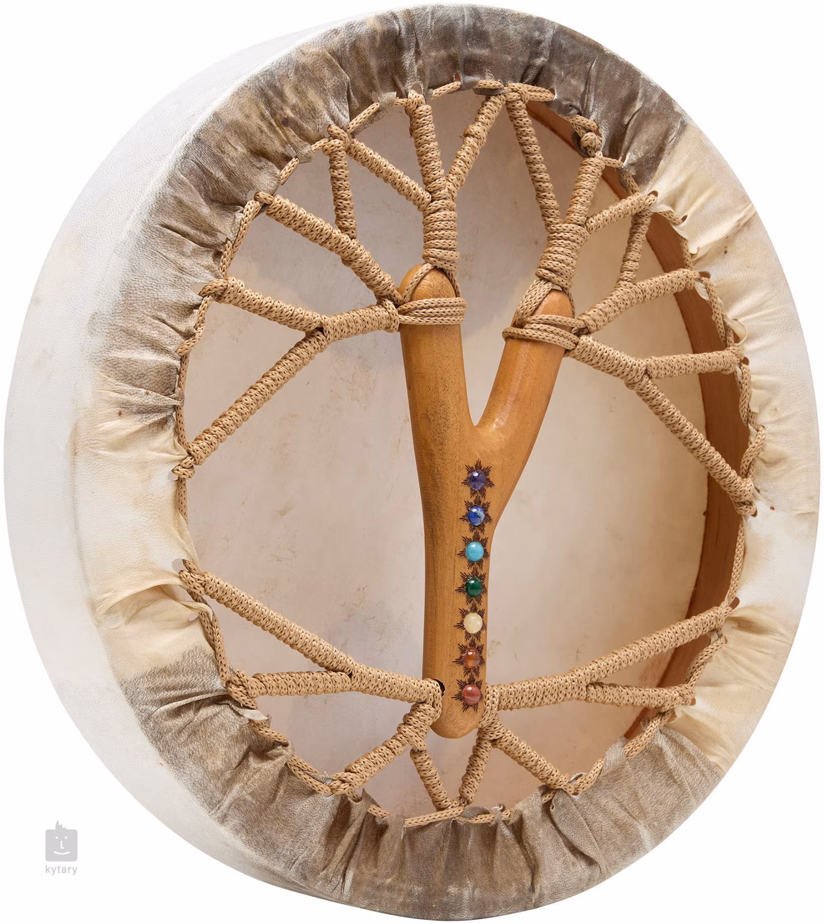 Średnica bębna wynosi 15,35″ (39 cm). Dzięki zastosowaniu naturalnych materiałów każdy egzemplarz jest oryginalny, dlatego wzór i faktura membrany mogą się nieznacznie różnić. W zestawie znajduje się miękki pokrowiec do bezpiecznego przechowywania i transportu oraz miękka pałka. Membrana: koźla skóra.