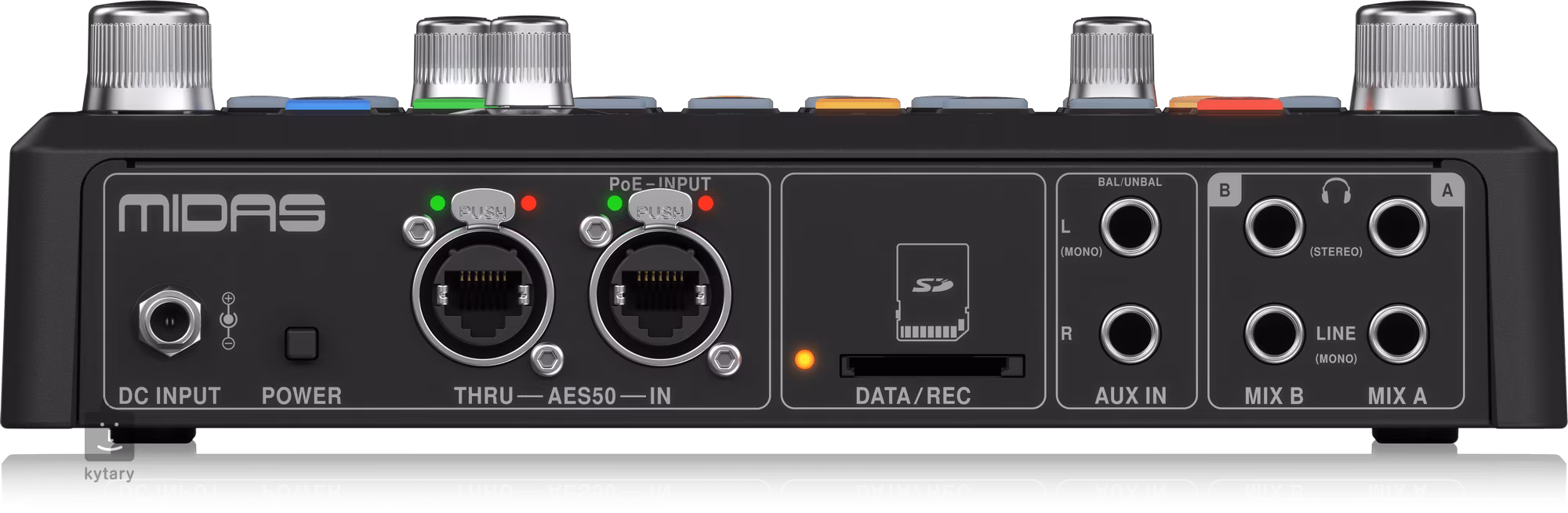 Midas DP48 to podwójny osobisty pulpit monitorujący z 48 kanałami, możliwością nagrywania na kartę SD, wbudowanym mikrofonem stereofonicznym i zdalnym zasilaniem. DP48 to nowa koncepcja w dziedzinie osobistego monitorowania, która pozwala dwóm wykonawcom w pełni kontrolować swój miks monitorowy i słyszeć dokładnie to, co chcą. Otrzymany dźwięk stereo można zapisać na karcie SD. Dzięki prostemu i intuicyjnemu interfejsowi oraz możliwości podłączenia do dowolnego urządzenia wyposażonego w interfejs AES50, DP48 może stworzyć kompletny system monitorowania idealny do użytku w studiu lub na scenie. DP48 zapewnia pełną kontrolę nad miksem monitorowym dzięki dwunastu grupom stereofonicznym z możliwością korekcji i kompresji, co pozwala na szybkie tworzenie i równoważenie odsłuchu. Wszystkie 48 kanałów można miksować w ramach tych grup. Na przykład wokaliści mogą umieścić wokale w grupie 1, podczas gdy perkusja, gitara basowa i kanały gitarowe mogą być umieszczone w grupach 2, 3 i 4. Perkusiści, którzy mają większe wymagania dotyczące monitorowania własnego zestawu, mogą za pomocą DP48 tworzyć bardziej złożone miksy odsłuchowe i samodzielnie miksować kick, snare i hihat, np. w grupach 1 do 3, a dwa mikrofony overhead w grupie 4. Wbudowany stereofoniczny mikrofon ambientowy zapewnia transmisję dźwięku ze sceny, który można następnie dodać do ogólnego miksowania, co pomaga pozbyć się poczucia izolacji, które powstaje podczas korzystania z monitoringu dousznego. Funkcja podwójnego miksowania umożliwia podłączenie dwóch użytkowników do jednego DP48, przy czym każdy z nich ma swój oddzielny grupowy miks stereo. Dla każdego z wyjść Mix A i B dostępne są trzy dedykowane elementy sterujące, które umożliwiają niezależną regulację odpowiedniej głośności wyjściowej, wybranego poziomu grupy i przypisanego poziomu My Group Level. Oba główne miksy są wyposażone w niezależnie regulowany korektor, poziom pogłosu Reverb i limiter - jest to szczególnie przydatne, gdy każdy z użytkowników używa innych słuchawek do monitorowania. Dostępne są dwa wyjścia słuchawkowe stereo (jack 6,3 mm) i dwa wyjścia liniowe mono (jack 6,3 mm). Wejście AUX jest przeznaczone np. do podłączenia metronomu, audio z komputera itp. Każde urządzenie DP48 może być zasilane zdalnie poprzez bezpośrednie połączenie AES50 z Midas HUB4 z funkcją zasilania przez Ethernet (PoE). Zasilanie jest również możliwe bezpośrednio za pomocą adaptera DC. Z DP48 kompatybilne są wszystkie urządzenia AES50 o częstotliwości 44,1/48 kHz, w tym cyfrowe konsole i skrzynki I/O Midas i Behringer, działa również przesyłanie oznaczeń kanałów wejściowych, w tym rozróżnienie kolorów. Kanały zwrotne AES50 umożliwiają również wysyłanie osobistych miksów z DP48 z powrotem do konsoli lub rozgałęźnika w celu podłączenia do bezprzewodowych nadajników IEM. Po podłączeniu do rozgałęźnika Midas, DP48 można skonfigurować i sterować zdalnie z konsoli mikserskiej. Aktualizacja oprogramowania sprzętowego Midas M32 4.0 obsługuje pełną konfigurację oznaczania kanałów konsoli mikserskiej i nazw grup bezpośrednio z interfejsu użytkownika konsoli.