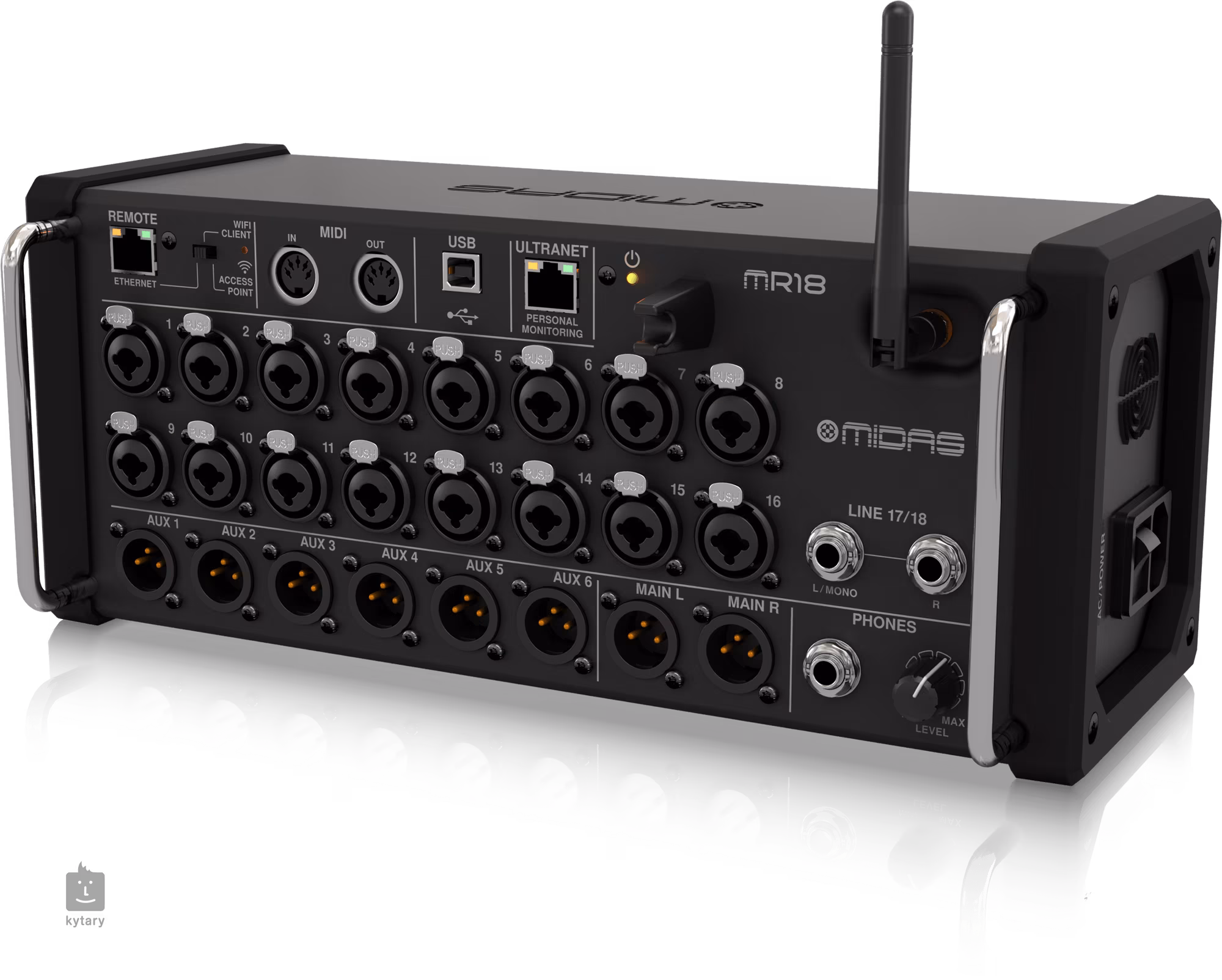 Midas M18 to cyfrowa konsola mikserska z możliwością sterowania za pomocą aplikacji na iPada lub tablet z systemem Android. Posiada 18 wejść, 16 przedwzmacniaczy mikrofonowych PRO, wbudowany router WiFi Tri-Mode, 18 x 18 kanałowy dwukierunkowy interfejs audio USB 2.0, łączność ULTRANET dla P-16 Personal Monitoring System, 6 szyn Aux i Main LR, wirtualny 6-pasmowy korektor parametryczny i 31-pasmowy korektor graficzny, cztery efekty cyfrowe, darmowe aplikacje iOS, Android i PC/Mac/Linux do zdalnego sterowania przez Ethernet, LAN lub WiFi oraz MIDI I/O.