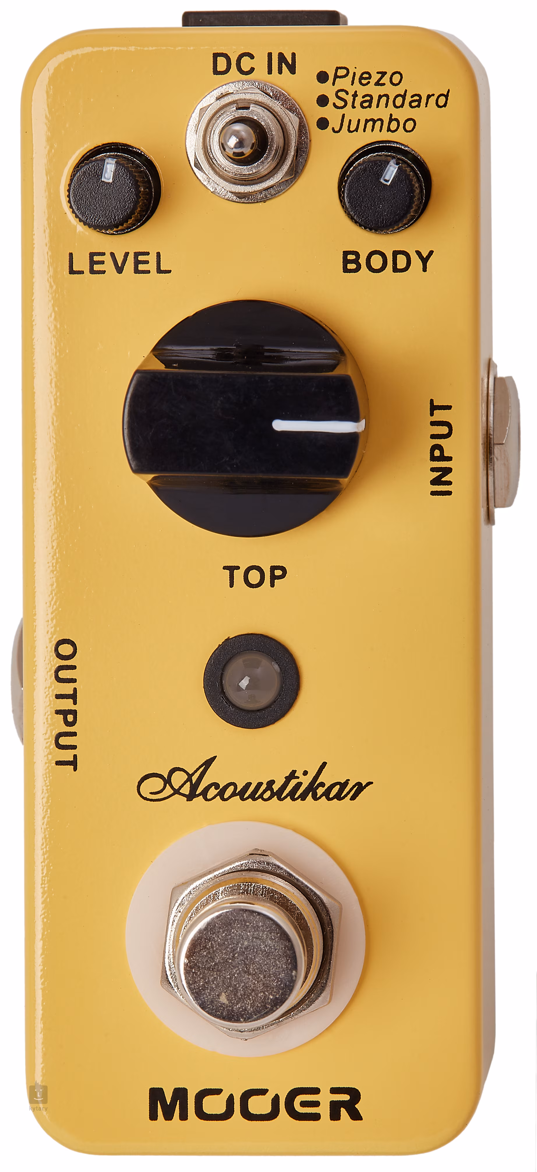 Acoustikar to kompaktowy efekt pedałowy z serii Micro chińskiej marki Mooer, który analogowo konwertuje czysty sygnał z gitary elektrycznej i przekształca go w dźwięk akustyczny, tj. symuluje brzmienie gitar akustycznych. Oferuje proste sterowanie i trzy tryby do wyboru - Piezo symuluje brzmienie gitar akustycznych z przetwornikami piezo, Standard symuluje brzmienie zwykłych gitar akustycznych, a Jumbo symuluje brzmienie gitar akustycznych z większym korpusem, tj. z wyraźniejszym basem. Pokrętła efektów określają głośność, stopień rezonansu instrumentu i ogólny blask brzmienia.