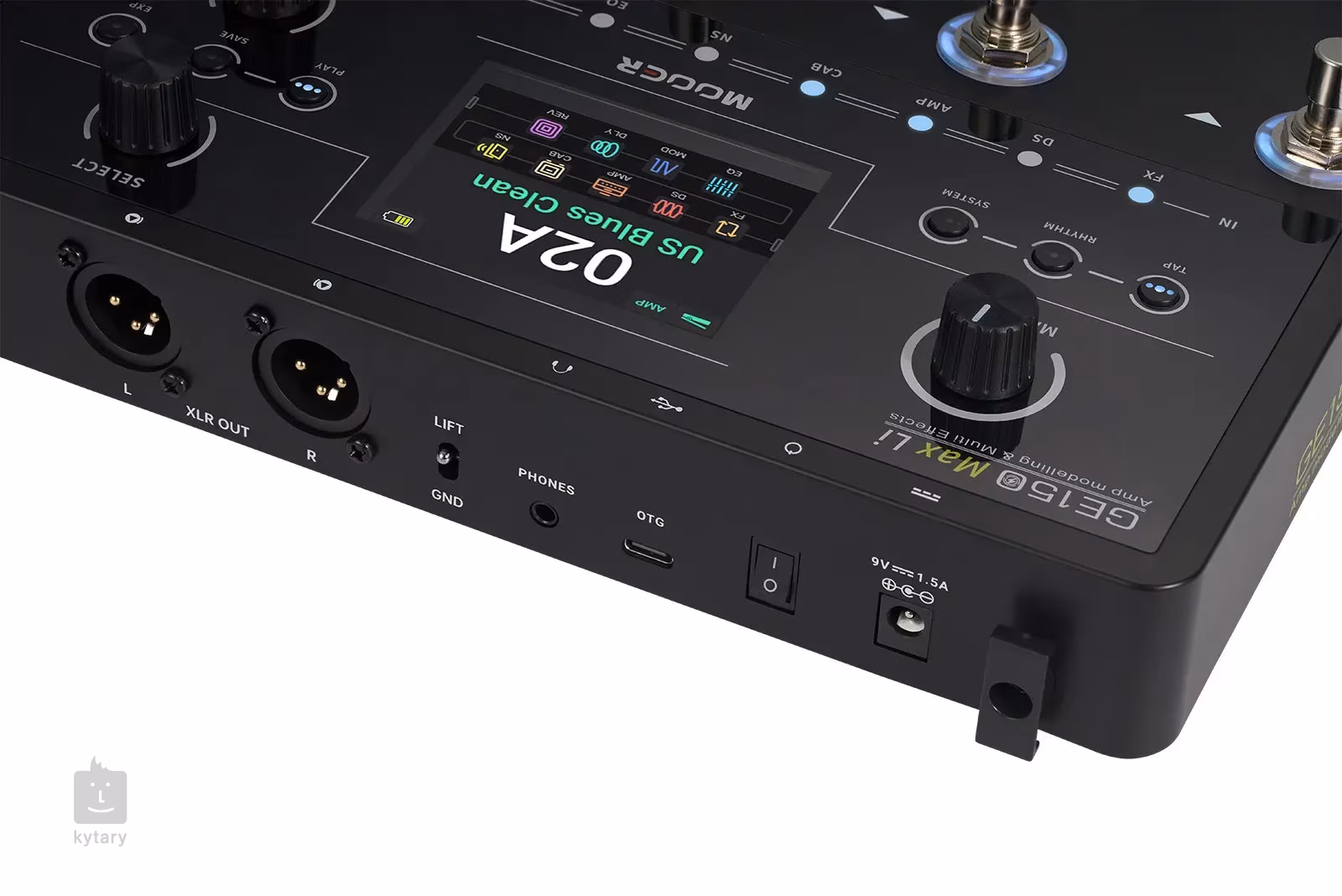 Gitarowy multiefekt MOOER GE 150 MAX LI stanowi kolejny krok w ewolucji serii GE 150. MOOER GE 150 MAX LI oferuje 50 banków po cztery presety w każdym, czyli 200 fabrycznych presetów, 55 modeli wzmacniaczy, 26 wysokiej jakości symulacji kolumn gitarowych, 170 efektów gitarowych, looper stereo z 80 sekundami czasu nagrywania, wbudowany metronom z dziesięcioma trybami, 40 patternów automatu perkusyjnego oraz zintegrowany pedał ekspresji. Osiem przełączników nożnych multiefektu umożliwia wygodne i szybkie przełączanie między funkcjami (wbudowany tuner, looper, tap tempo) oraz standardowymi presetami, efektami i bankami. Zmieniono również wygląd panelu tylnego, który zawiera wejście mono, dwa wyjścia (L/Mono, stereo), dwoma symetrycznymi wyjściami XLR do łatwego podłączenia do miksera, złączem USB typu C (nagrywanie OTG, edycja efektów i presetów, aktualizacja oprogramowania), wyjściem słuchawkowym oraz wejściem aux in do odtwarzania podkładów muzycznych z zewnętrznych źródeł.