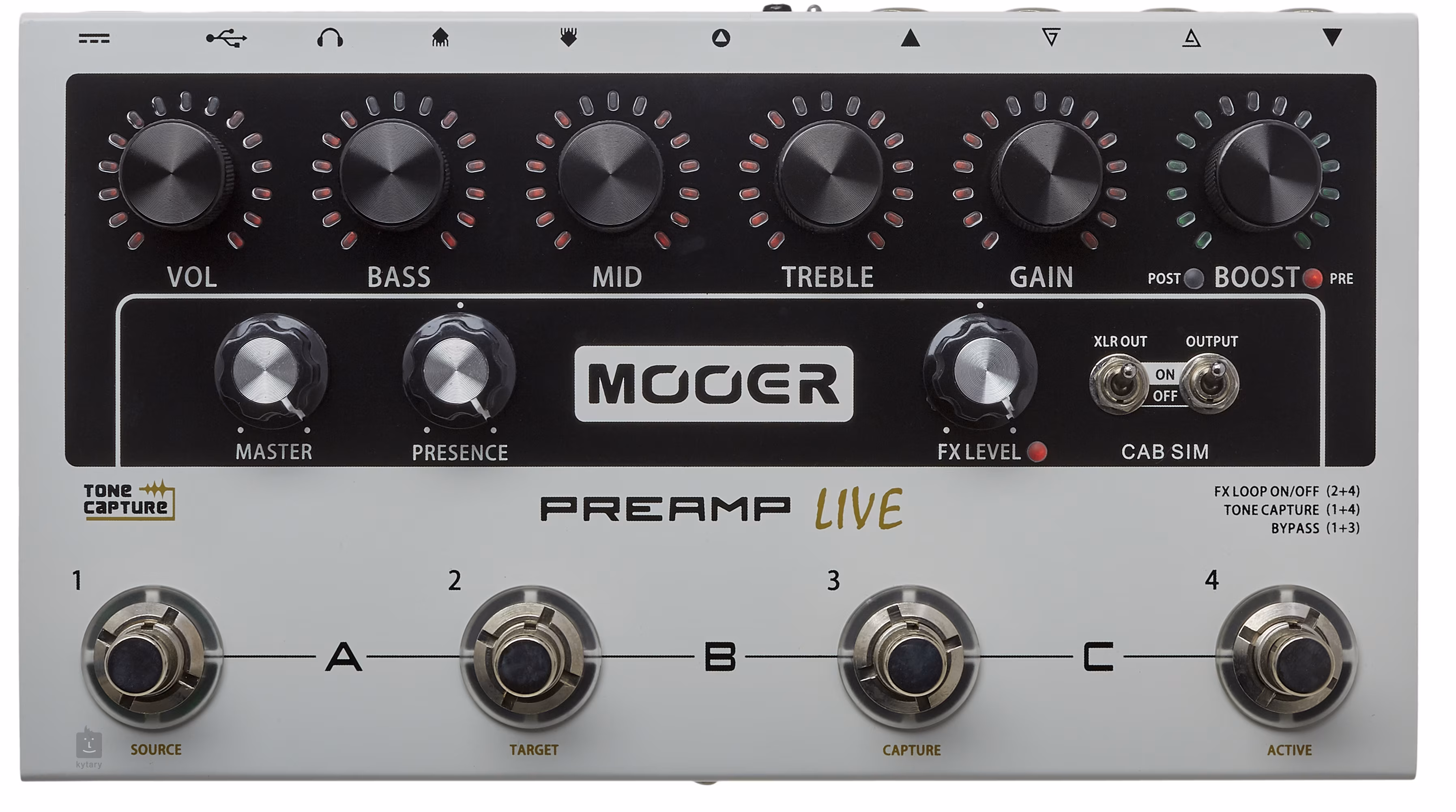 4x FS, Vol, Bass, Mid, Treble, Gain, Boost, Master, Presence, FX Level, 2x Cab Sim On/Off switch