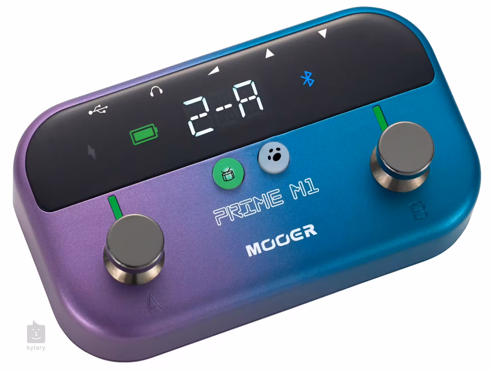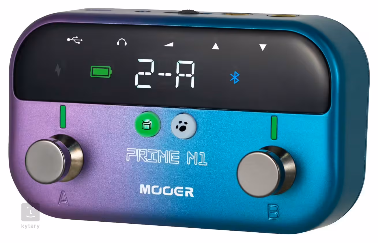 Wszystkie te funkcje można łatwo kontrolować za pomocą dwóch przycisków nożnych i czytelnego wyświetlacza LED. Przyciski nożne są wielofunkcyjne i obsługują różne zadania, niezależnie od tego, czy chodzi o przewijanie presetów, aktywację tunera, wyzwalanie loopera czy sterowanie funkcją tap tempo. Na panelu sterowania znajduje się dedykowany przycisk dla modułu perkusyjnego. Głośność główną można znaleźć na tylnym panelu. Pod względem łączności, multi-efekt jest wyposażony w jedno wejście mono i jedno wyjście stereo. Oferuje również wyjście słuchawkowe jack 3,5 mm i port USB-C, który obsługuje nagrywanie OTG (On-the-Go) bezpośrednio do aplikacji Mooer Prime. Urządzenie umożliwia również strumieniowe przesyłanie dźwięku za pomocą wspomnianego Bluetooth, co przyda się podczas ćwiczeń i jammowania. W zestawie znajduje się kabel USB-C do ładowania (pudełko wytrzymuje do 5 godzin na jednym ładowaniu).