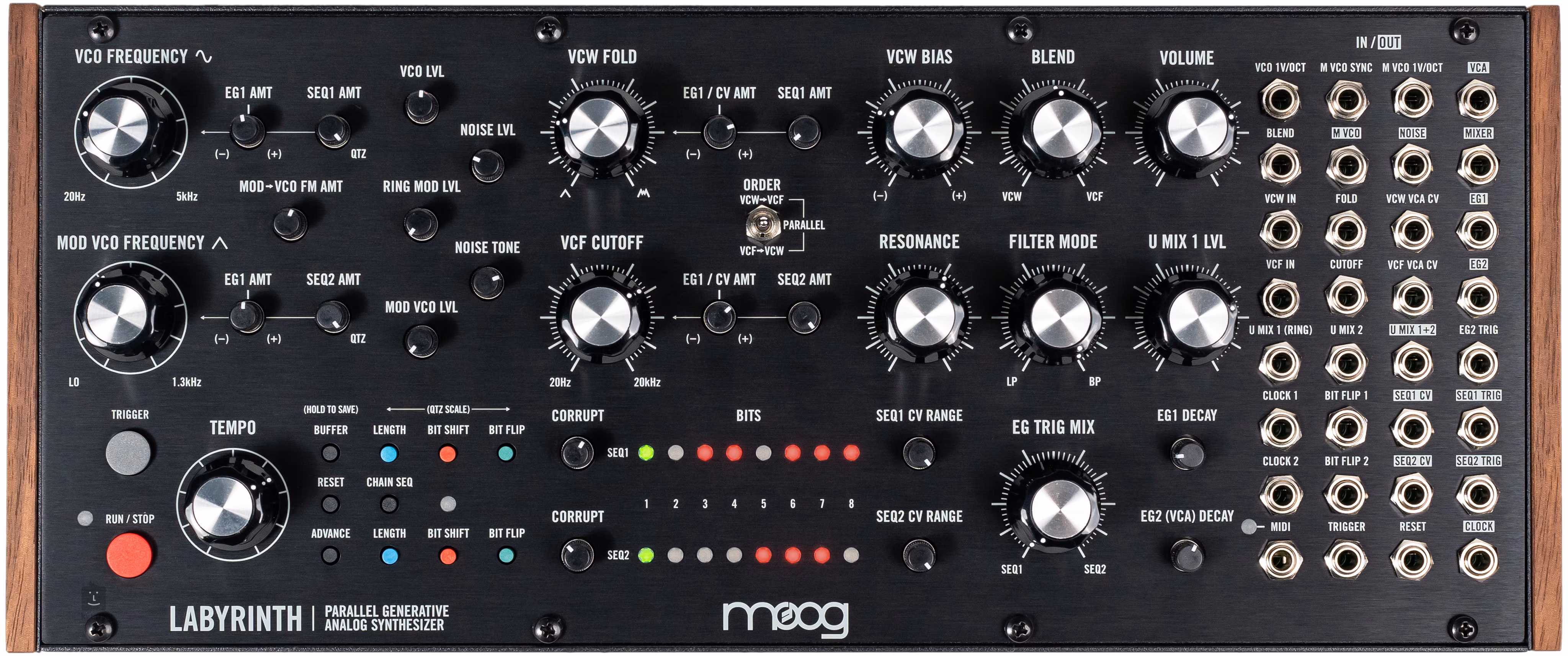Labyrinth jest w pełni samodzielnym instrumentem, ale równie dobrze nadaje się do dodawania głębi do istniejącego Euroracka i świetnie sprawdzi się do znajdowania odpowiednich dźwięków w studiu lub grania z nim na żywo dla pewności siebie. Jeśli jesteś jednym ze szczęśliwych posiadaczy innych syntezatorów Moog, to wiedz, że Labyrith jest doskonałym towarzyszem Matriarch, na przykład, gdy pozwalasz Labyrinth improwizować, podczas gdy używasz klawiatury Matriarch do grania. Lub połącz Labyrinth i Spectravox, aby uzyskać piękny ruch spektralny, lub połącz Labyrinth z Mavis w racku 104HP, aby uzyskać rozszerzoną modularność. Możliwości są praktycznie nieograniczone.