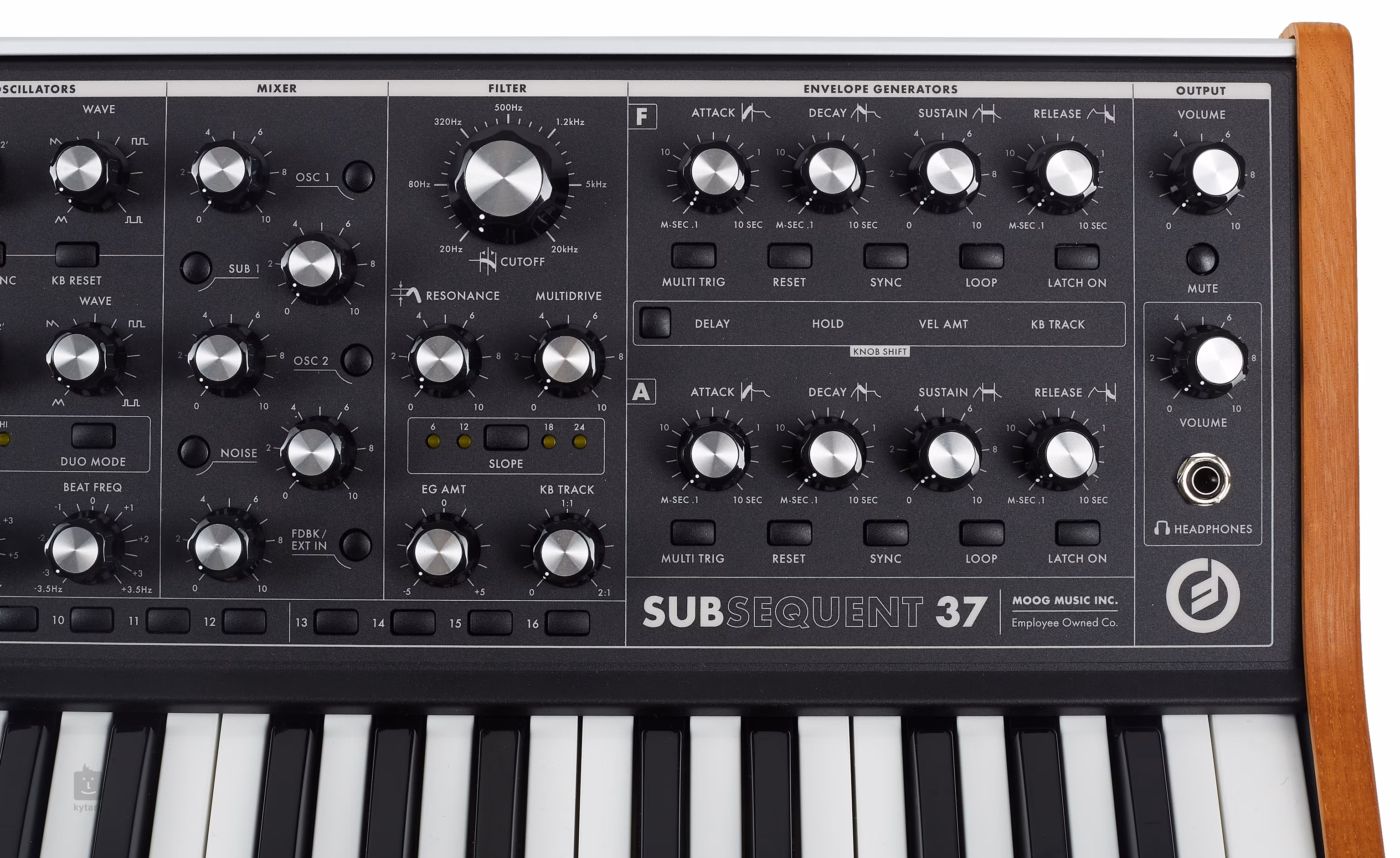Dźwięk analogowy = Moog. Subsequent 37 jest kontynuacją modelu Sub 37 i jest to analogowy syntezator z parafonią (2 nuty). Na przednim panelu znajduje się łącznie 40 pokręteł i 74 przełączniki, dzięki czemu można natychmiast dopracować i dostosować dźwięk w najdrobniejszych szczegółach.