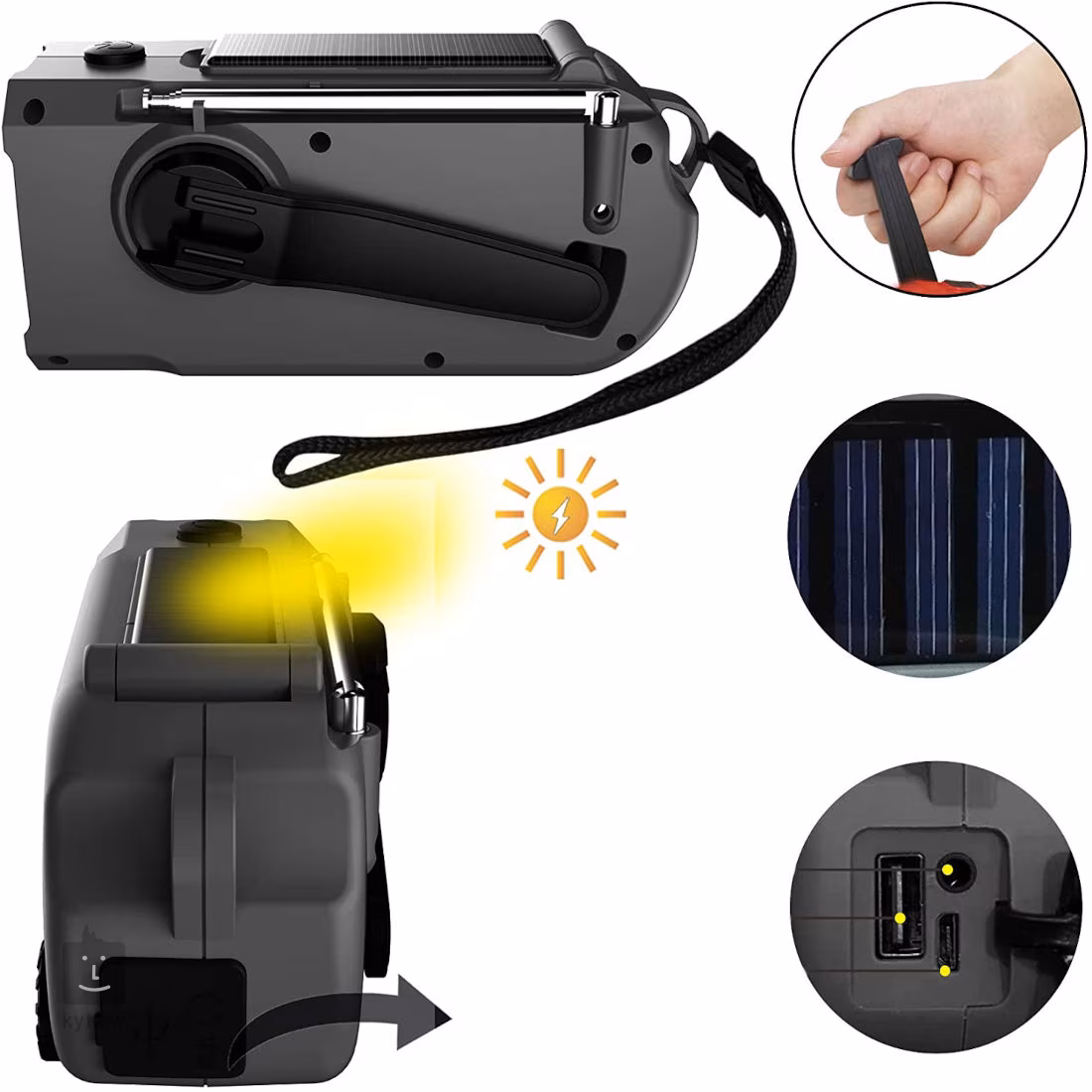 Radio obsługuje nie tylko standardowe pasma AM i FM, ale także częstotliwości SW (SW1 i SW2), dzięki czemu nie zgubisz się nawet tam, gdzie zwykły sygnał zawodzi. Zasilanie jest maksymalnie elastyczne – oprócz klasycznego micro USB można skorzystać z panelu słonecznego lub dynamo, które zapewniają energię nawet bez dostępu do sieci elektrycznej. Wbudowana bateria 5000 mAh zapewnia wystarczającą ilość energii do długiej pracy radia, a także do ładowania telefonu lub innych małych urządzeń. Oczywistością jest również wydajna latarka 3W, praktyczna lampka do czytania i wyjście 3,5 mm na słuchawki.