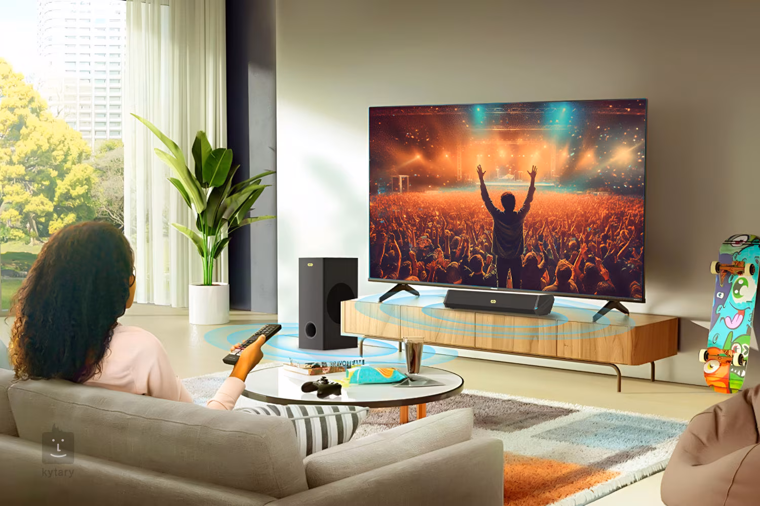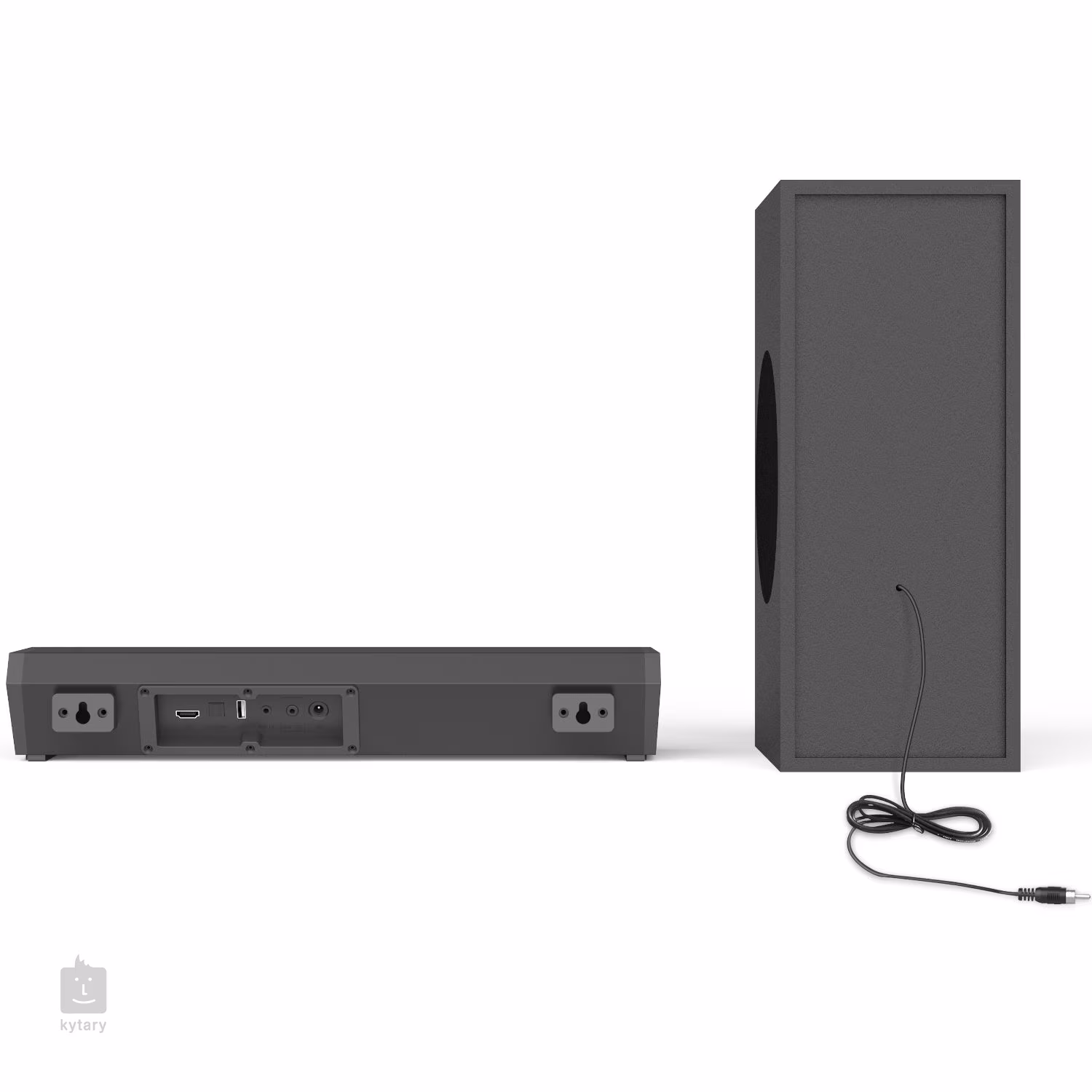 Dzięki wielu wbudowanym portom, w tym HDMI-Arc, optycznym i analogowym, można podłączyć zestaw do praktycznie dowolnego urządzenia. Wbudowany moduł Bluetooth z łatwością zamieni telefon i tablet w kino domowe. Subwoofer wykonany jest z litego drewna MDF, które w połączeniu z 5-calowym głośnikiem zapewnia głębokie basy. Jest on połączony z głośnikiem centralnym za pomocą kabla i można go zamontować na ścianie.